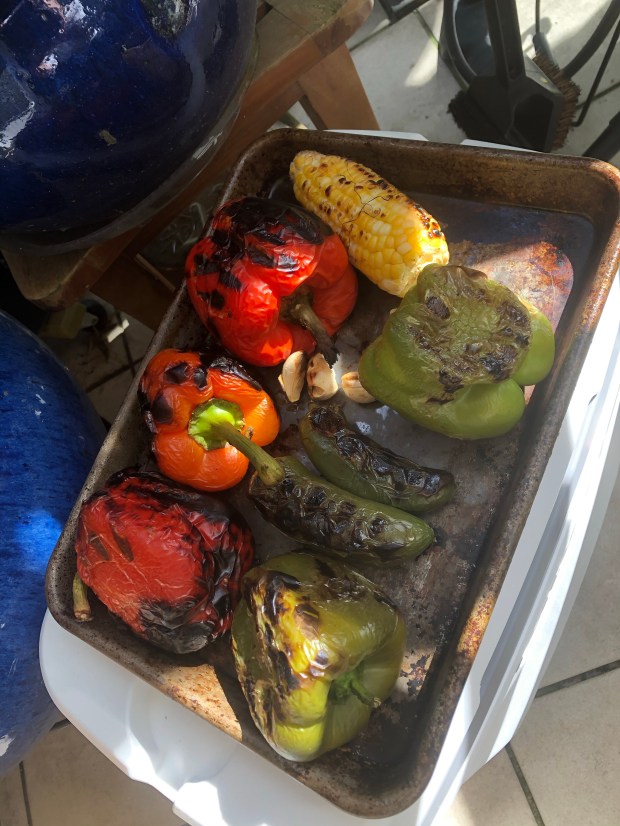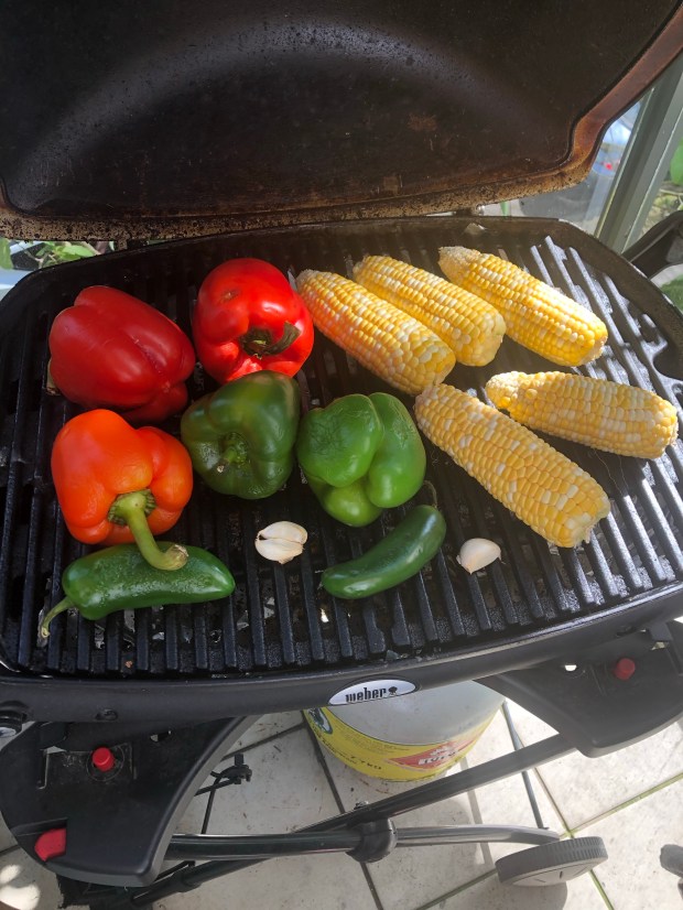 Turn the temperature of your BBQ to 400 degrees Farenheit and put all your veggies and garlic on. Every once in a while turn them with your tongs to ensure they are cooking evenly. Once everything has a bit of char on it take them off the BBQ using the sheet pan.