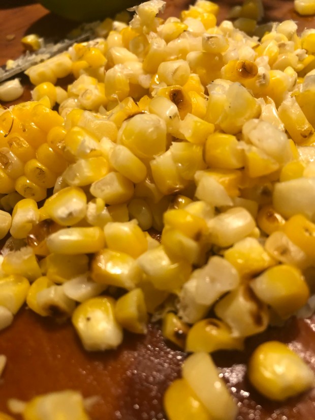With a sharp knife remove all the corn from the husks and then place into the bowl.
