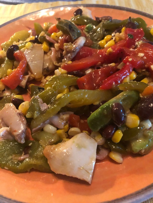 Let them cool in your kitchen and cut into the jalapeños, the Bell peppers, taking out all the seeds. For the jalapeños leave some of the seeds as they will give the dish a bit of heat. If you don’t like anything spicy take out all the seeds. Then cut the veggies into strips and then into little pieces. Put everything into a bowl.