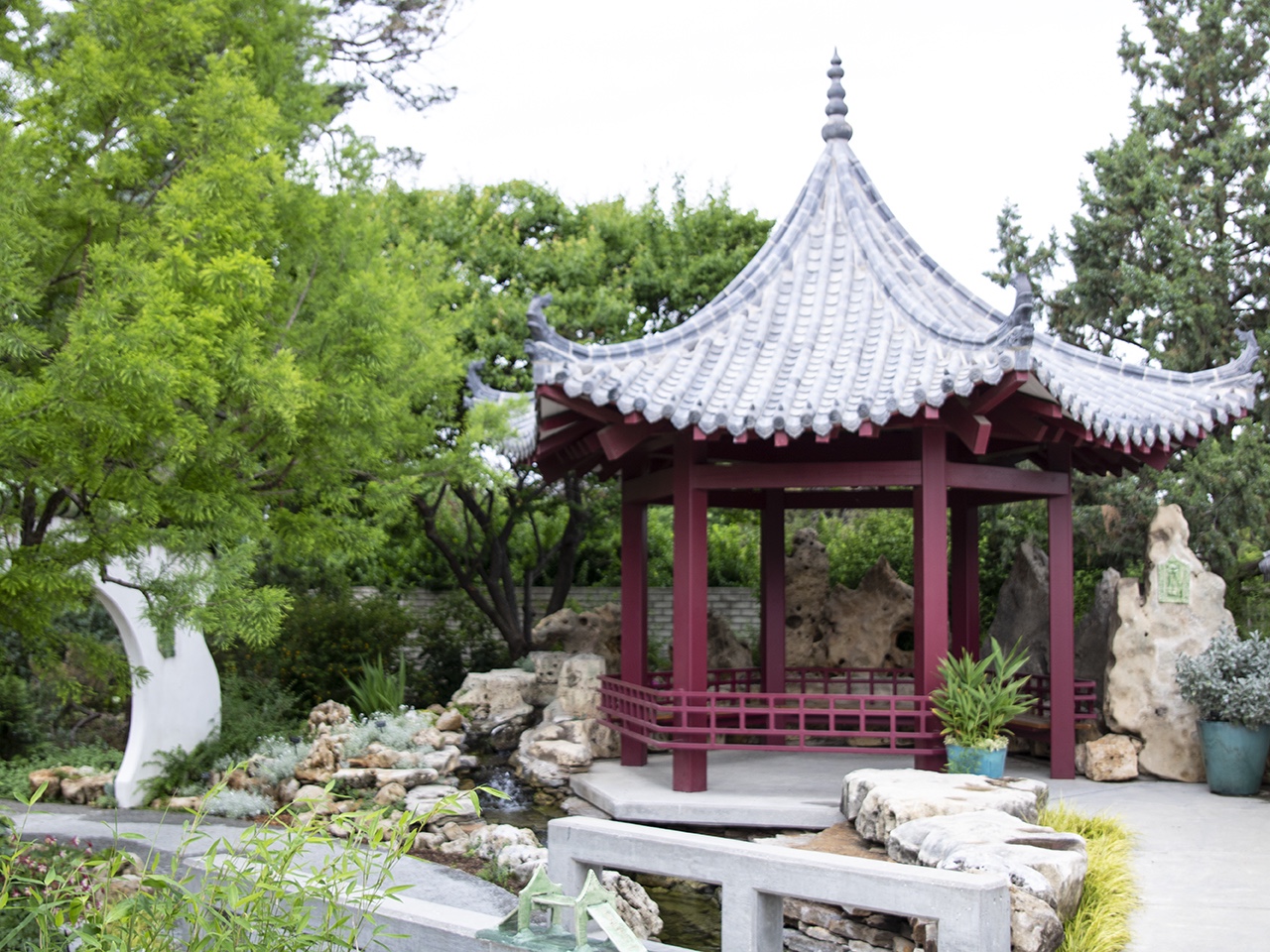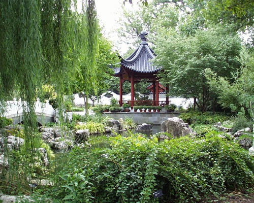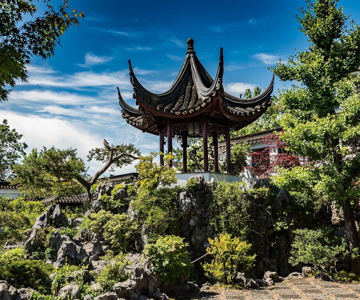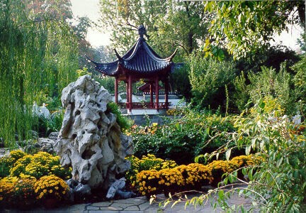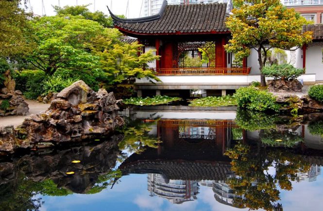 Chinese gardens are designed to recreate and miniaturize significant landscapes – all containing a building or pavilion, decorative rocks, plants, trees, flowers, and water elements.