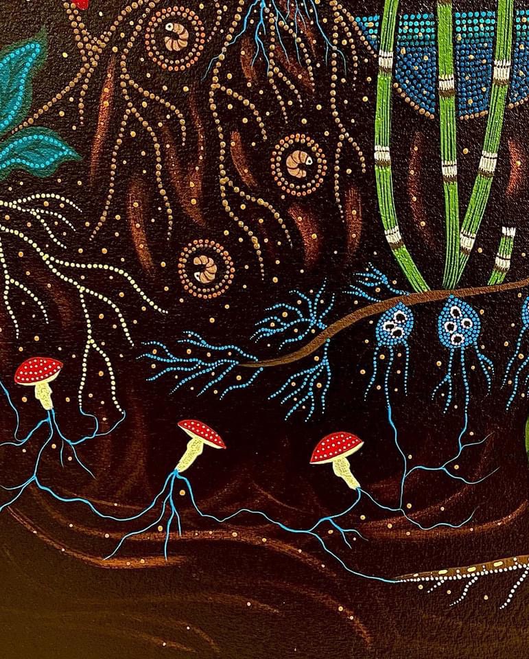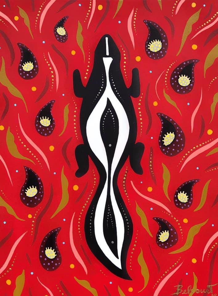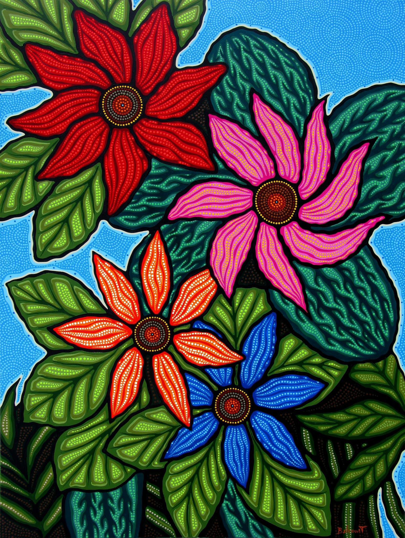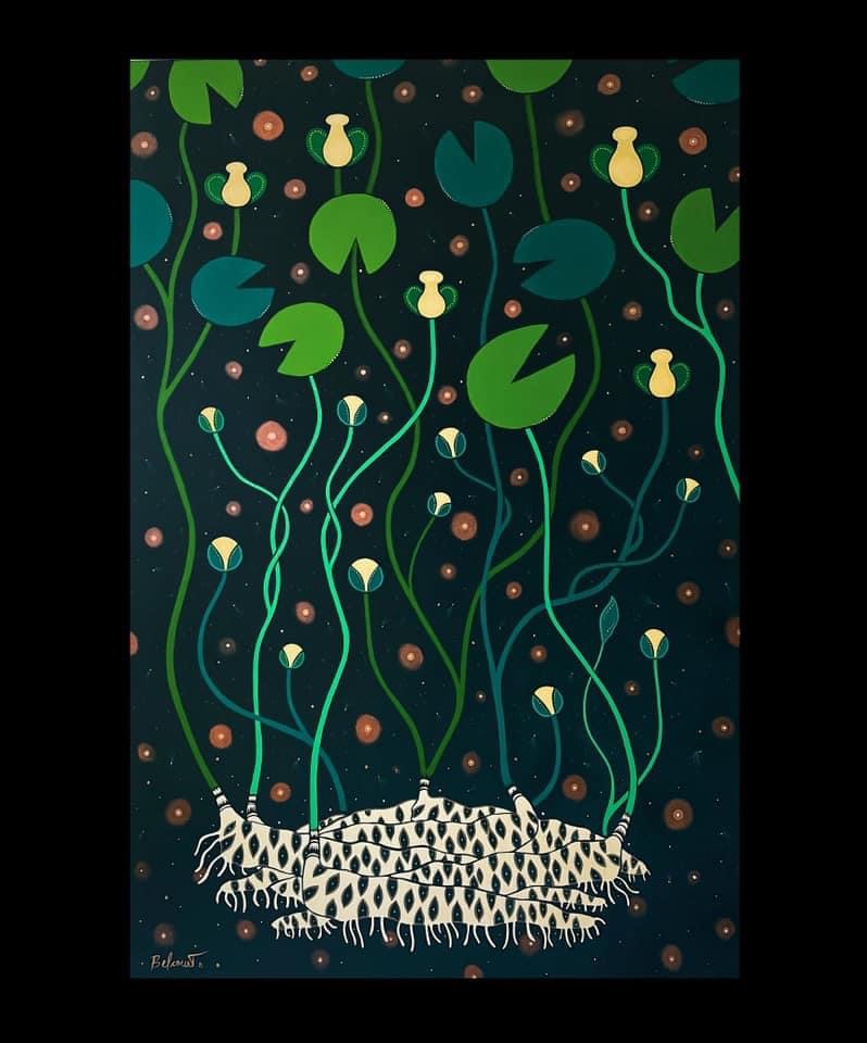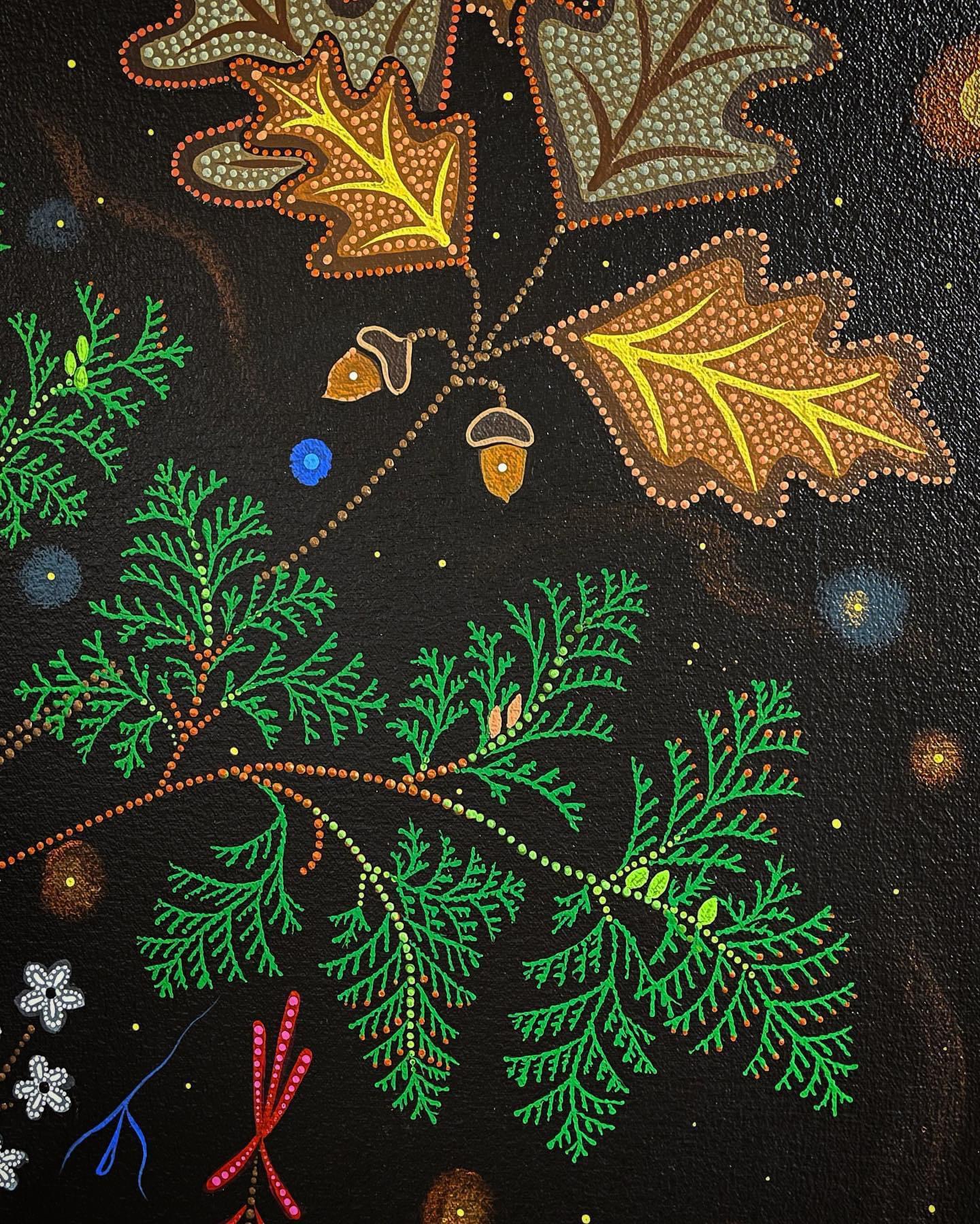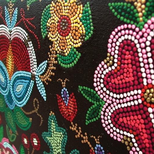 Belcourt took her inspiration from these beadwork’s – simulating thousands of beads with a paintbrush using acrylic paint – first by adding a few dots here and there, later expanding to the full-fledged dotting method.
