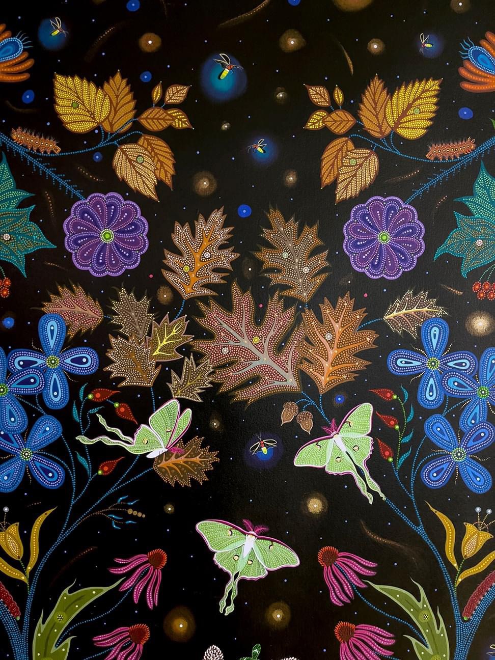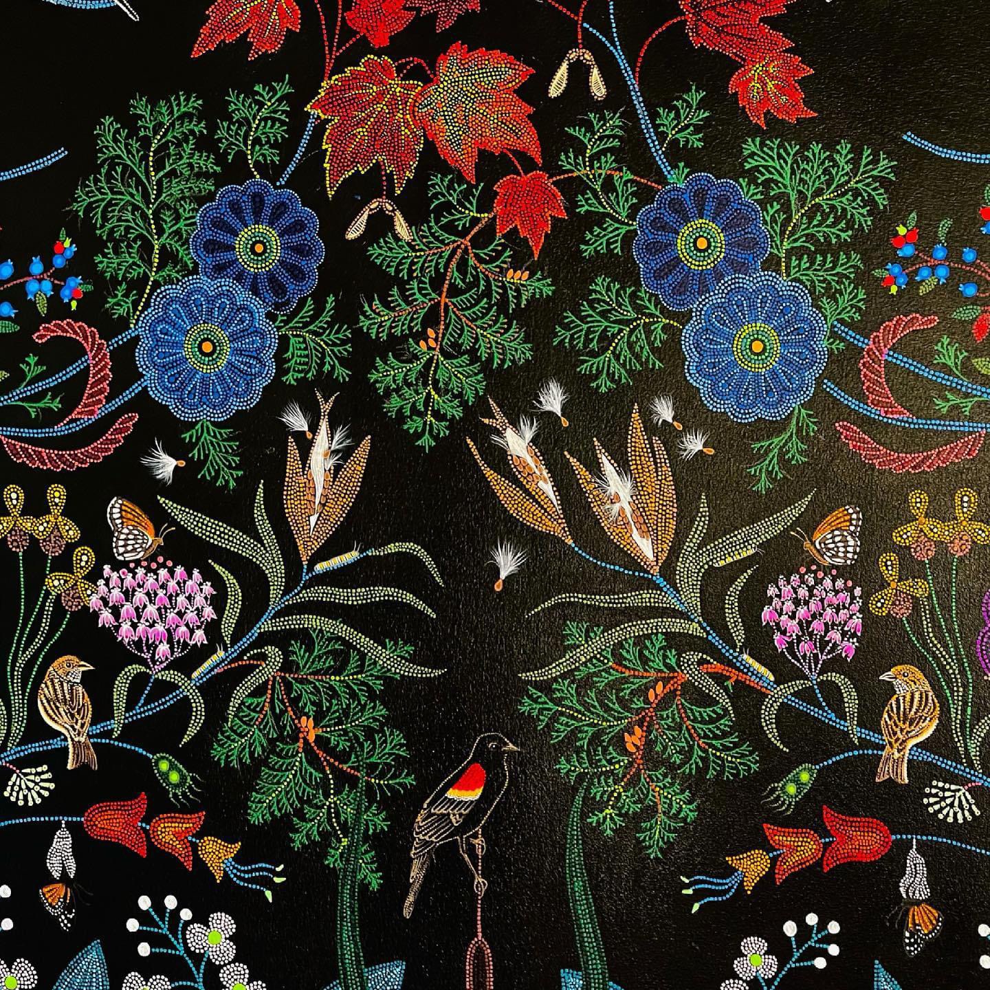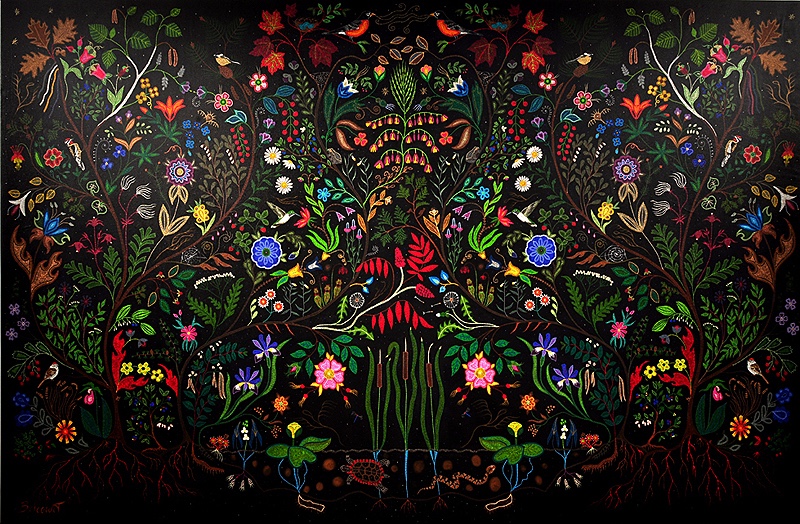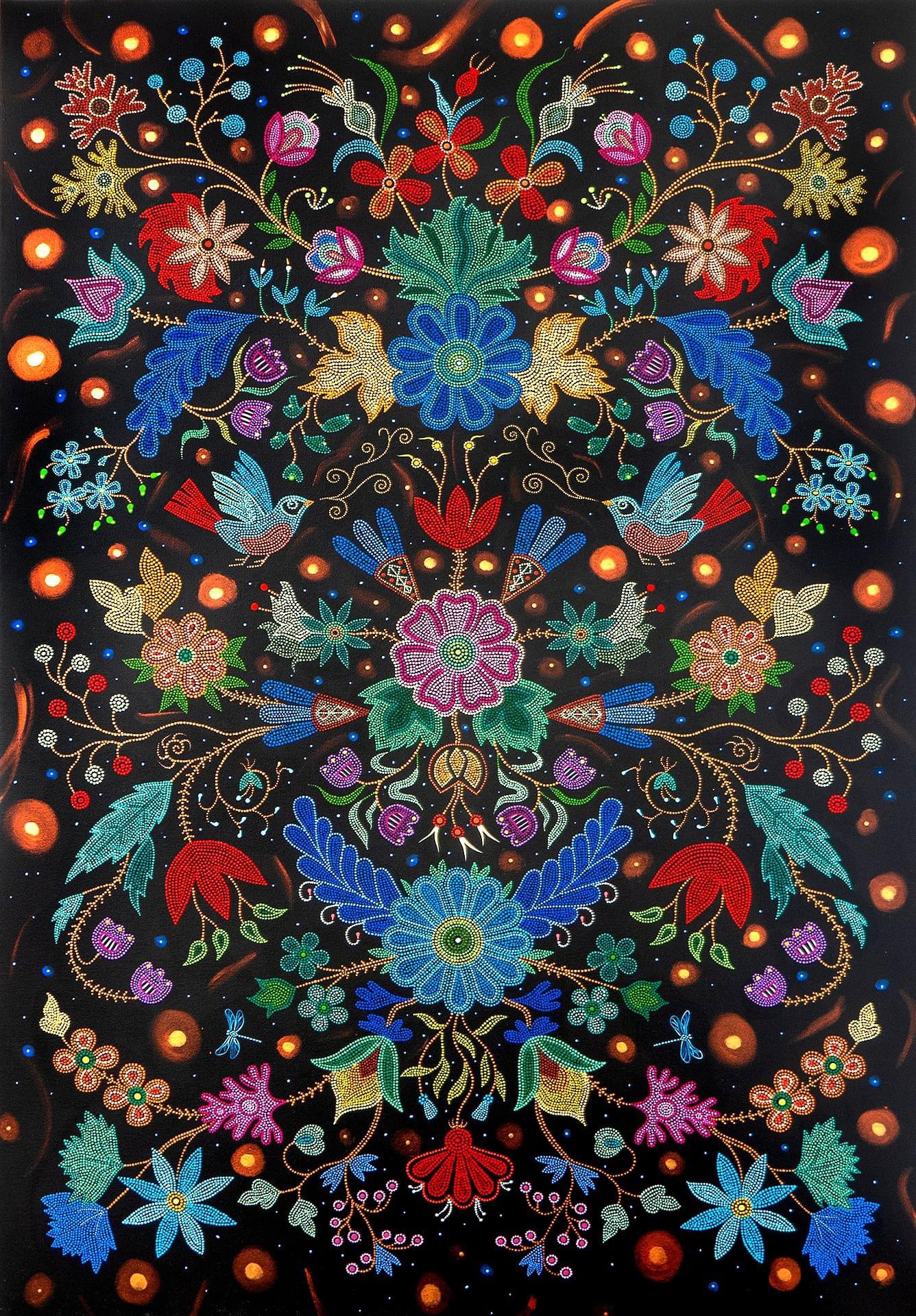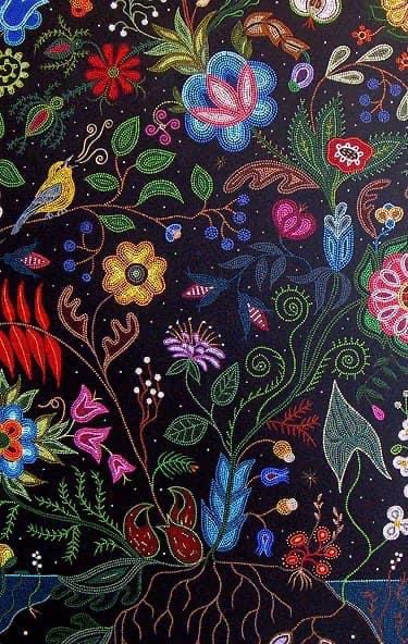 A Canadian Métis – French European and First Nations people – her art references traditional beadwork and quillwork of her culture, coming together, creating a swirling, majestic, tribute to Mother Nature.