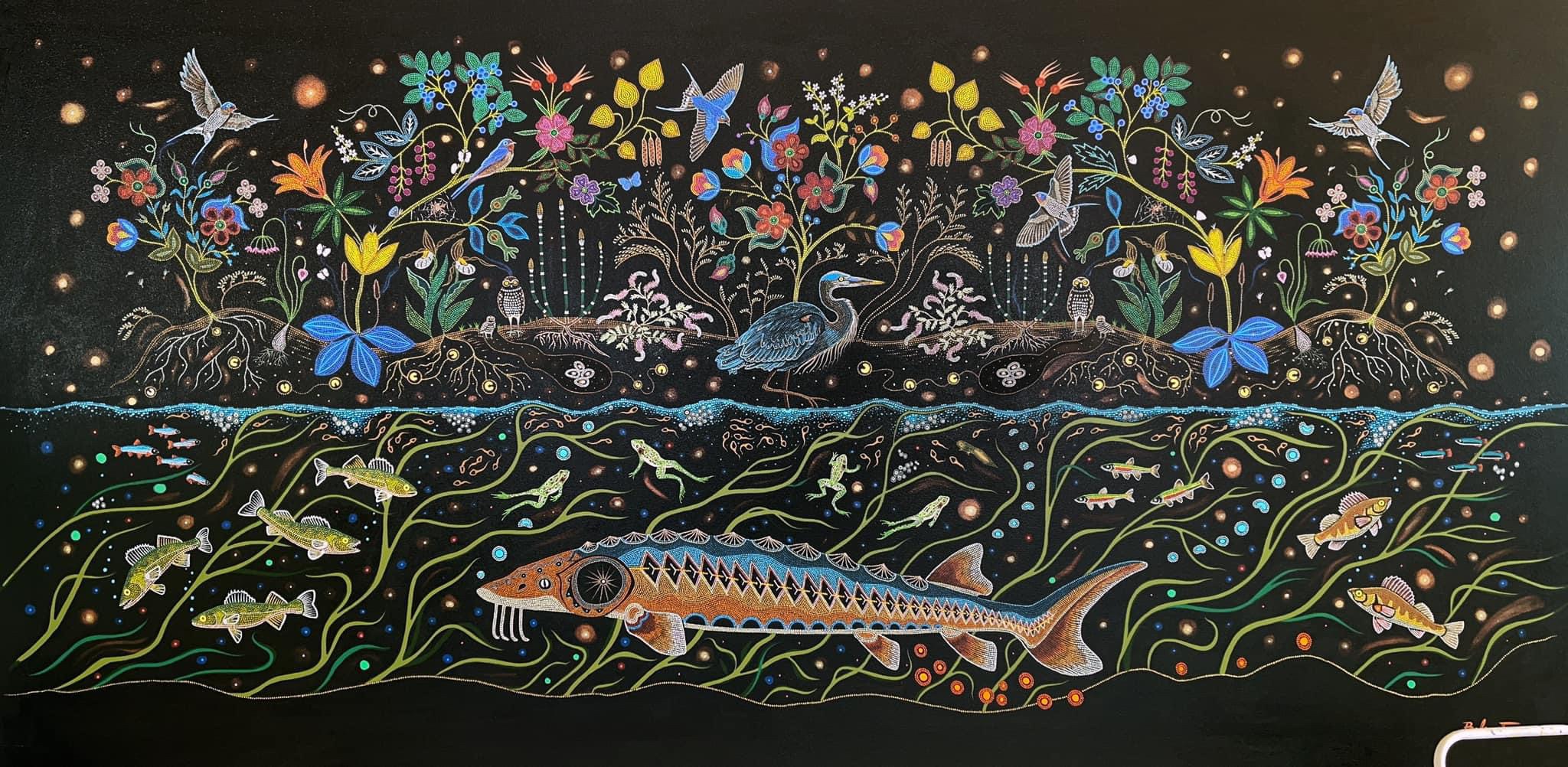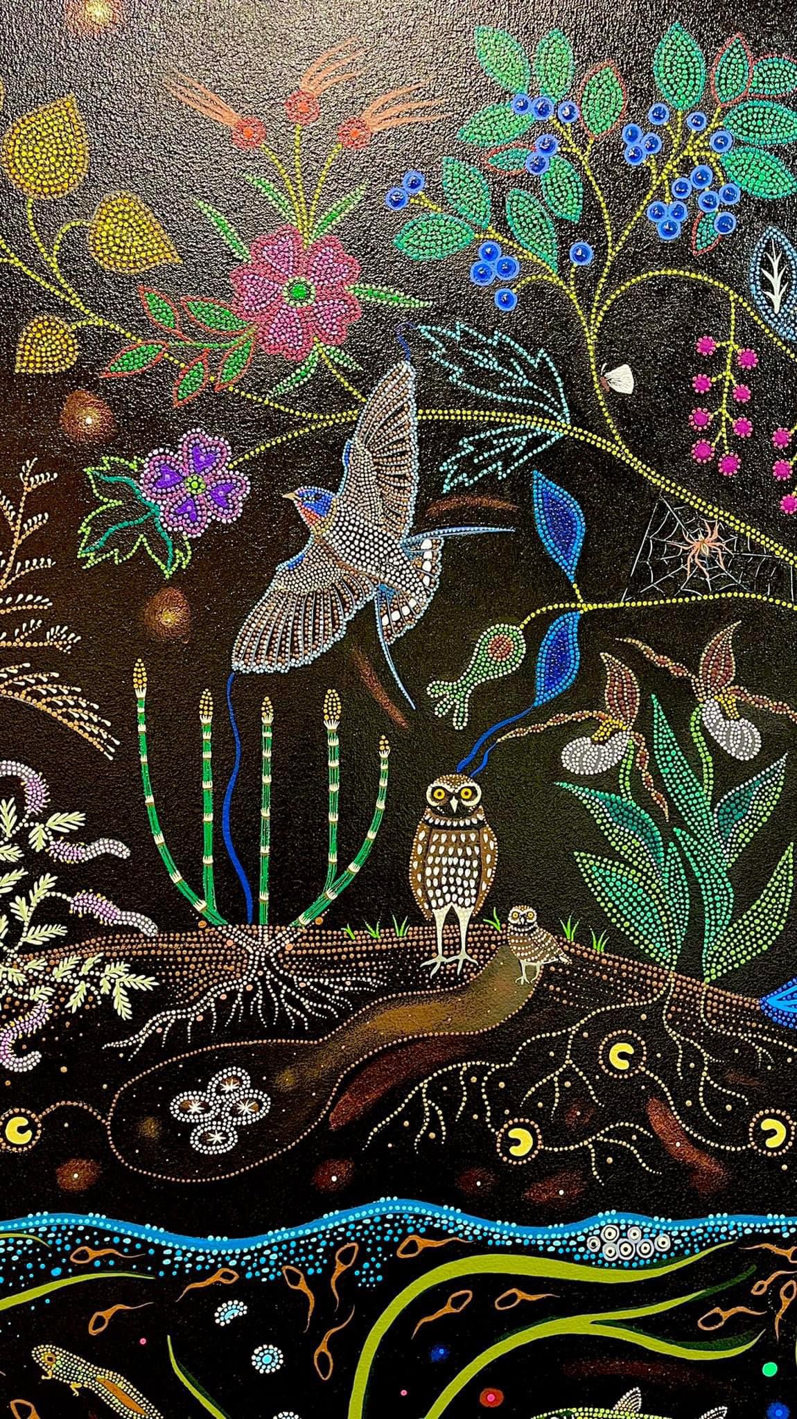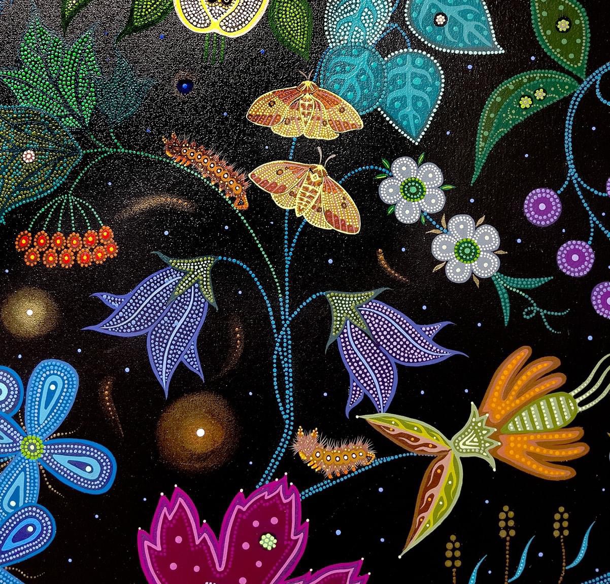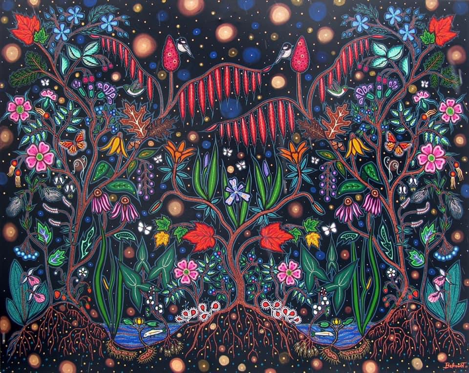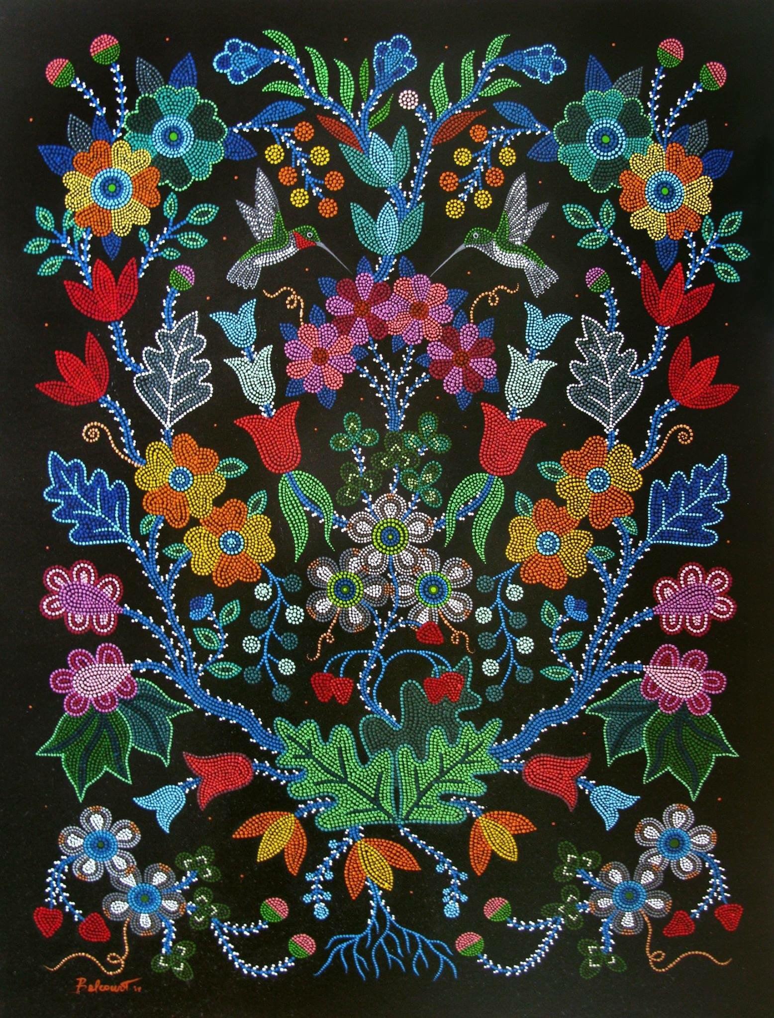 A Canadian Métis – French European and First Nations people – her art references traditional beadwork and quillwork of her culture, coming together, creating a swirling, majestic, tribute to Mother Nature.