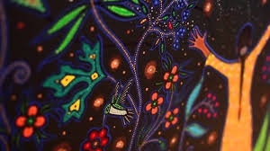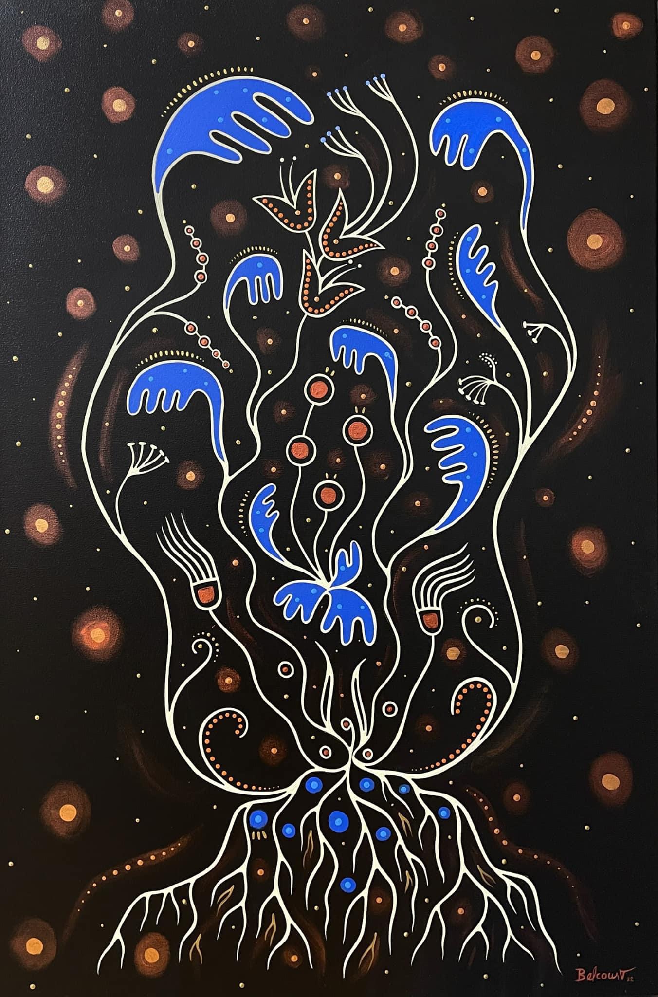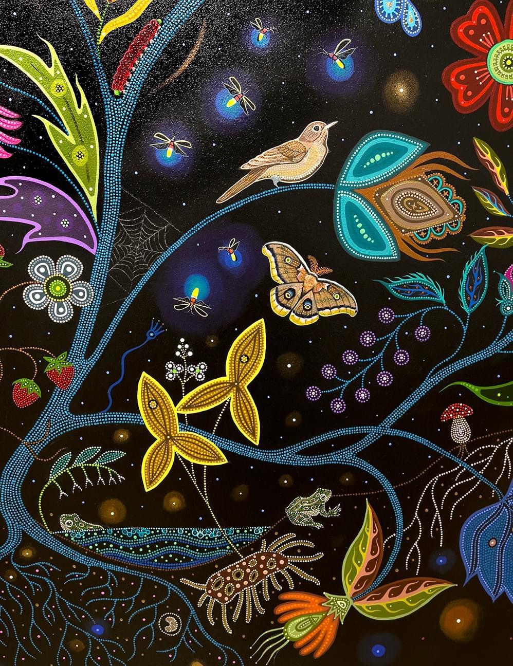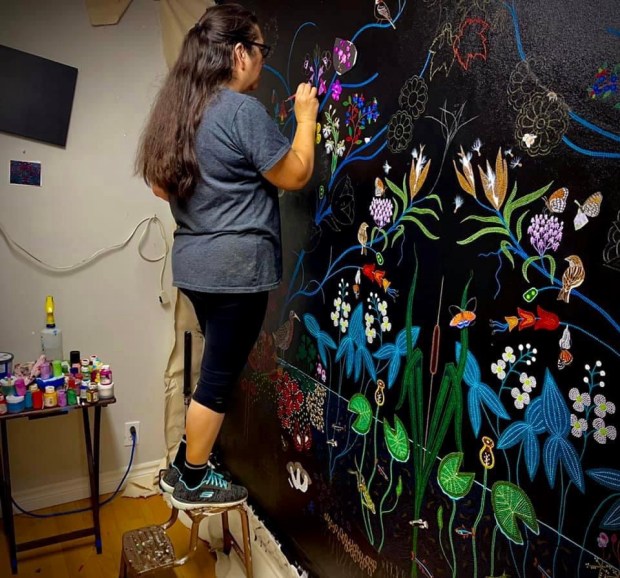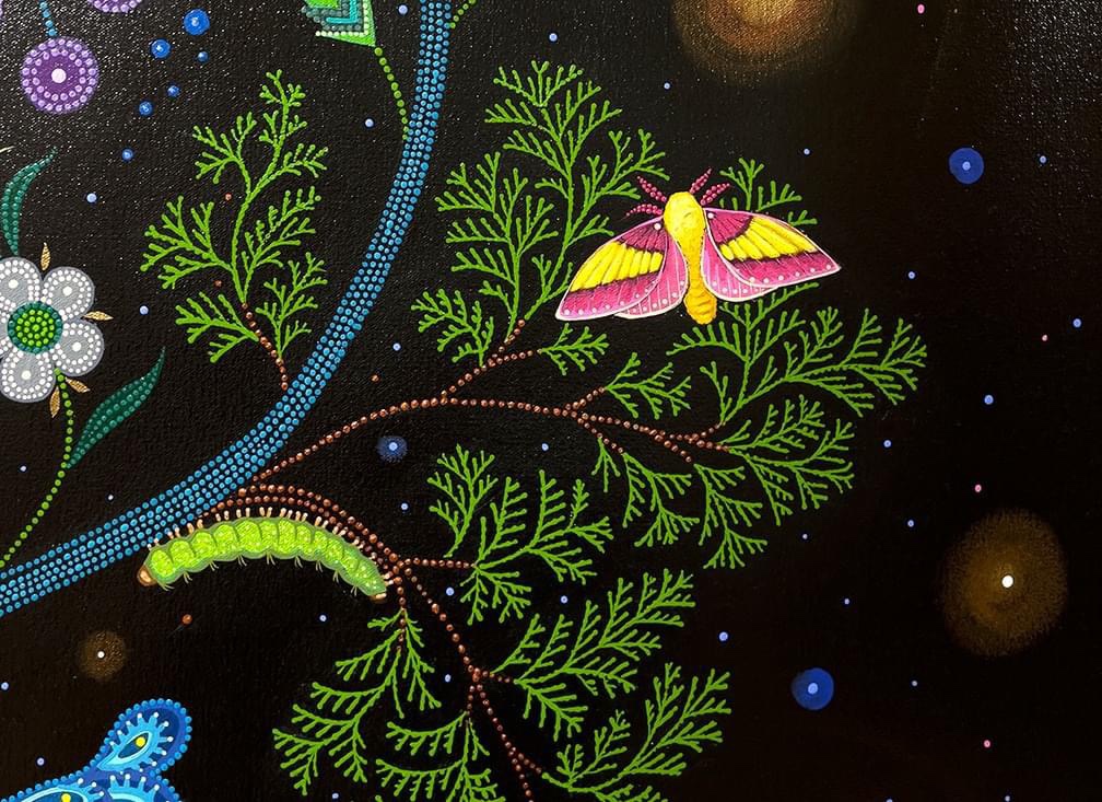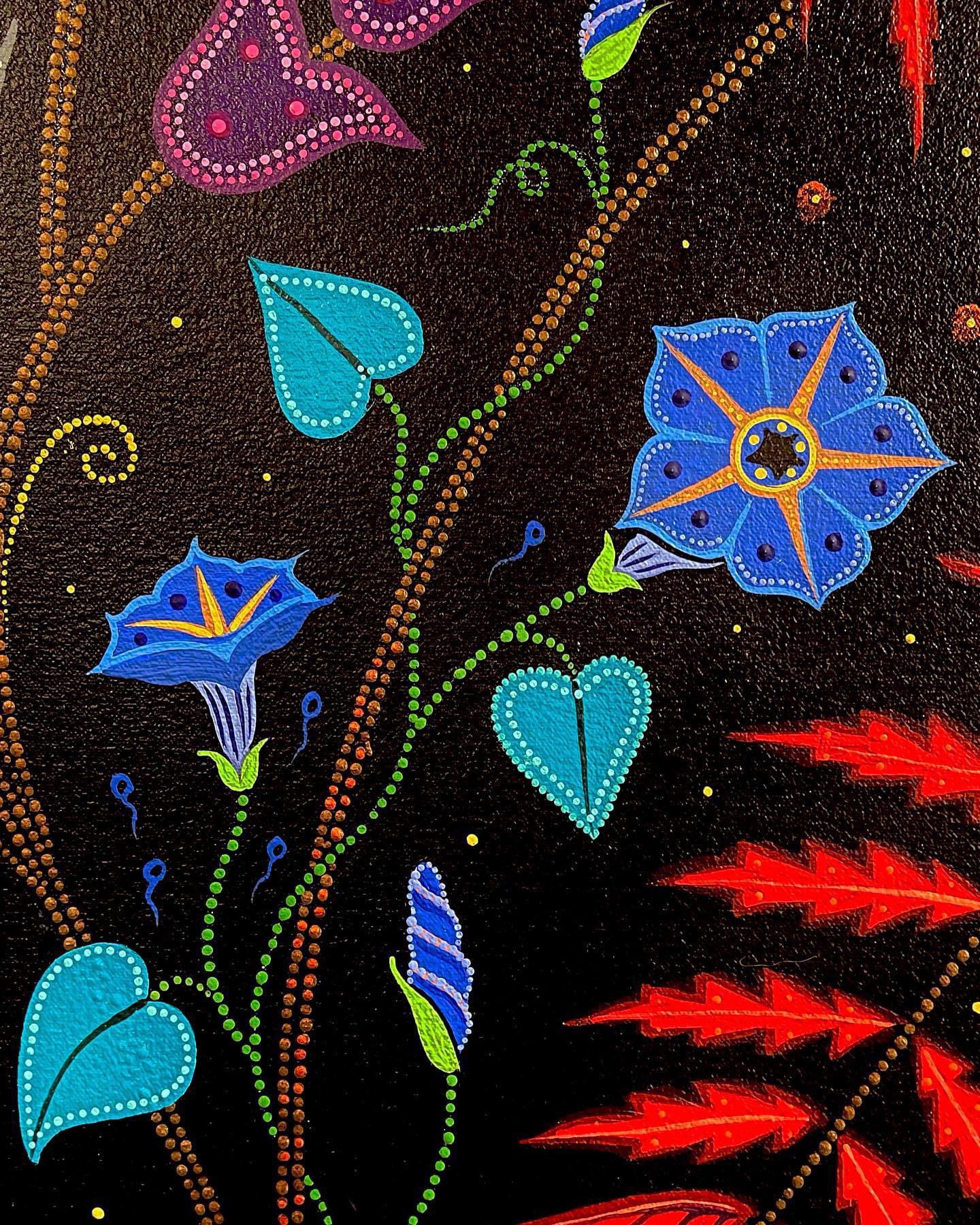 A Canadian Métis – French European and First Nations people – her art references traditional beadwork and quillwork of her culture, coming together, creating a swirling, majestic, tribute to Mother Nature.