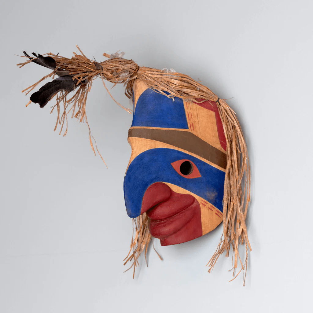 Dick’s name in the Kwakw’ala language means “big, great whale.” His carvings often feature Dzunuk’wa, the “wild woman of the woods,” and her counterpart, Bakwas, “wild man of the woods.” These supernatural figures loom large in Kwakwaka’wakw cosmology and also in Dick’s practice. Bakwas is a stealer of souls.