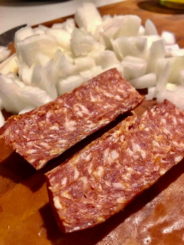 In the meantime slice your bacon, onion, celery, carrots and garlic into small chunks.