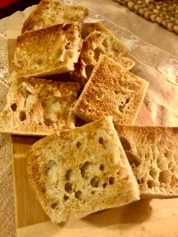 Slice your baguette in half and place in a pre-heated oven at 400 degrees Fahrenheit and bake for about 15 minutes or so, till the baguette turns a dark brow.