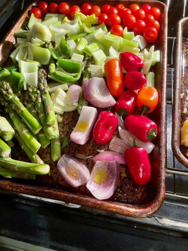 On another large sheet pan add your vegetables, drizzle with olive oil, season with salt and pepper. Once the potatoes have been in the oven for 10 minutes, add your vegetables. This will ensure the vegetables and potatoes are done in the same time.
