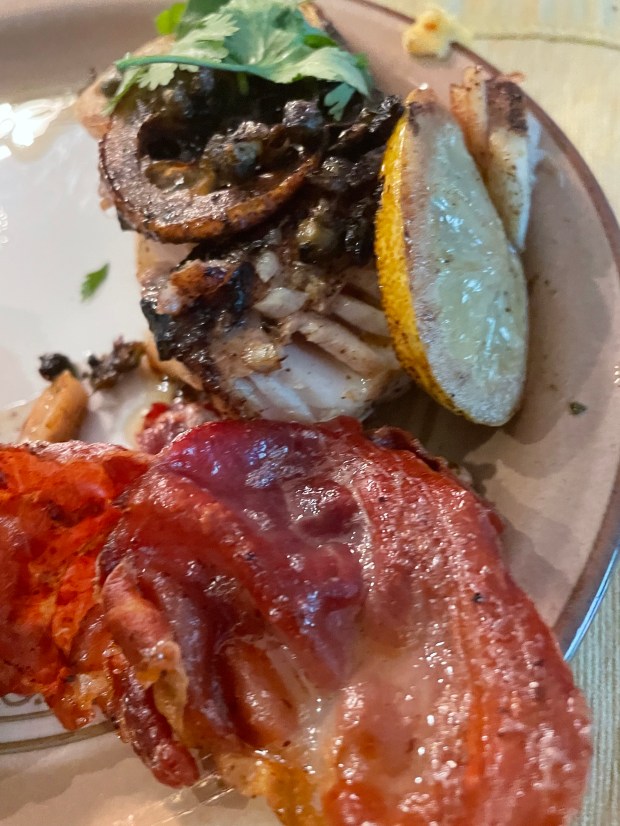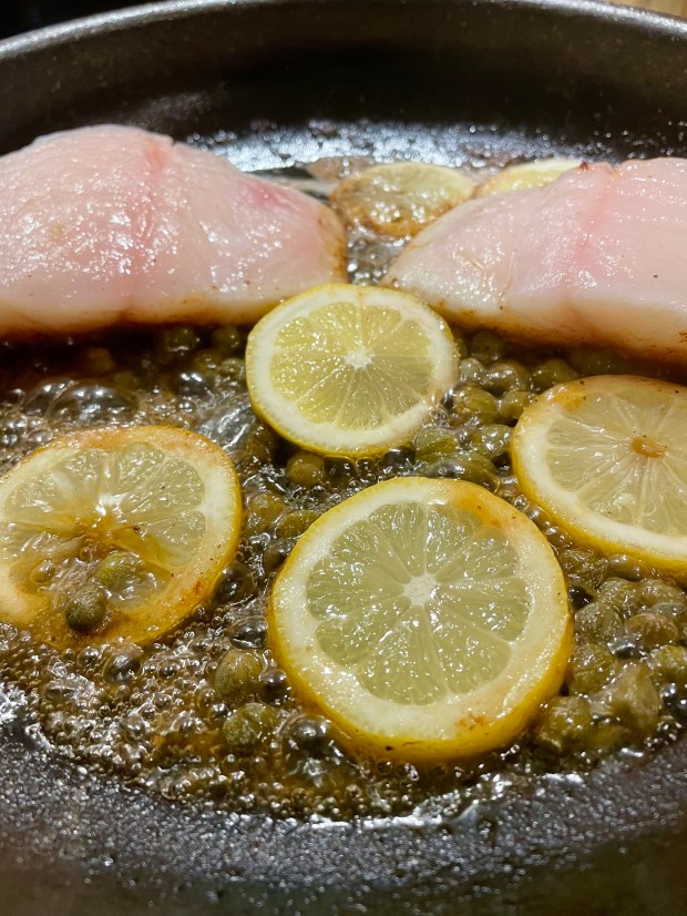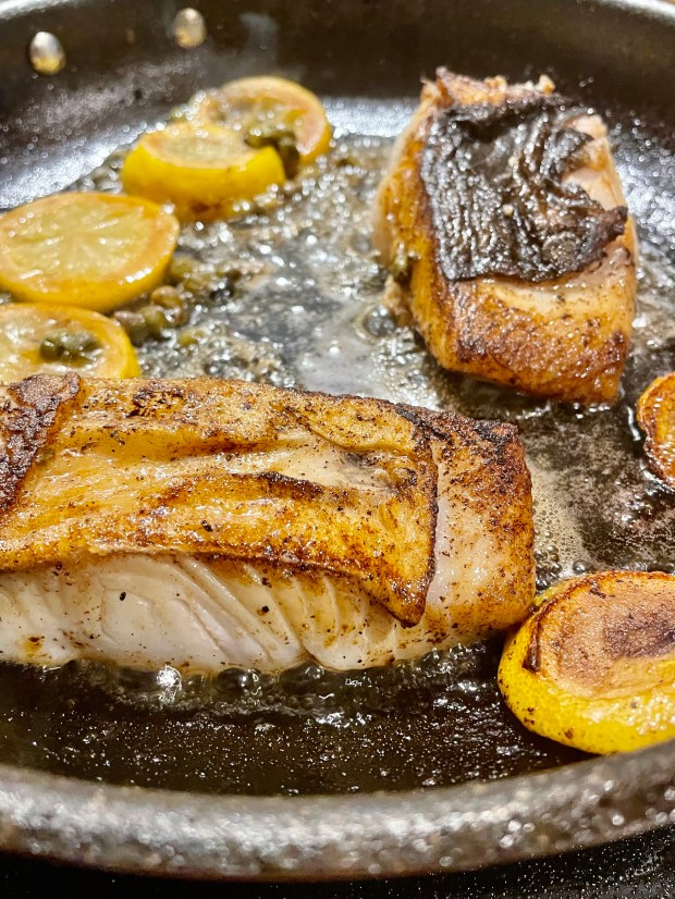 Put 3 tablespoons butter, 1 tablespoon olive oil, into the frying pan, turn up heat on your stove top gradually to medium, making sure the mixture does not burn, when it’s slightly brown, add the fish, skin down. Cook for five minutes and turn fish over, adding your lemon slices, capers, and lemon juice. Cook for anywhere from another 3 to 5 minutes, also keep basting the fish with the sauce in the pan and moving the lemon slices and capers around.