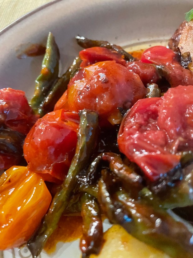 Pre-heat your oven to 425 degrees Farenheit. Line your sheet pan with parchment paper, add the beans and cherry tomatoes, season with salt and pepper, add the olive oil and using your hands rub the oil into the veggies. Season with salt and pepper. Bake in the oven for 25 minutes until some of the veggies have a bit of a char on them. If not turn your oven settings to broil and finish once they are a bit charred.