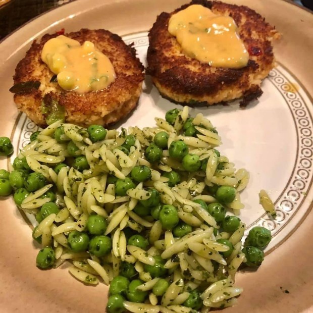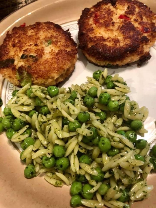 YUMMYLICIOUS CRAB CAKES, ORZO WITH PARSLEY PESTO, PEAS, SHAVED ASPARAGUS SALAD, FOR TWO