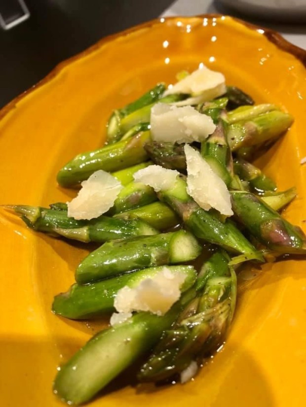 The raw asparagus salad is nice and crunchy – a bit tart, but perfect with the rich Orzo and crab cakes.