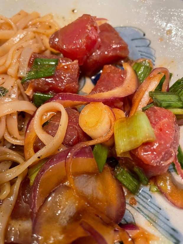 Simple, easy, fast, delicious, that’s the tuna poke, noodle, dinner.