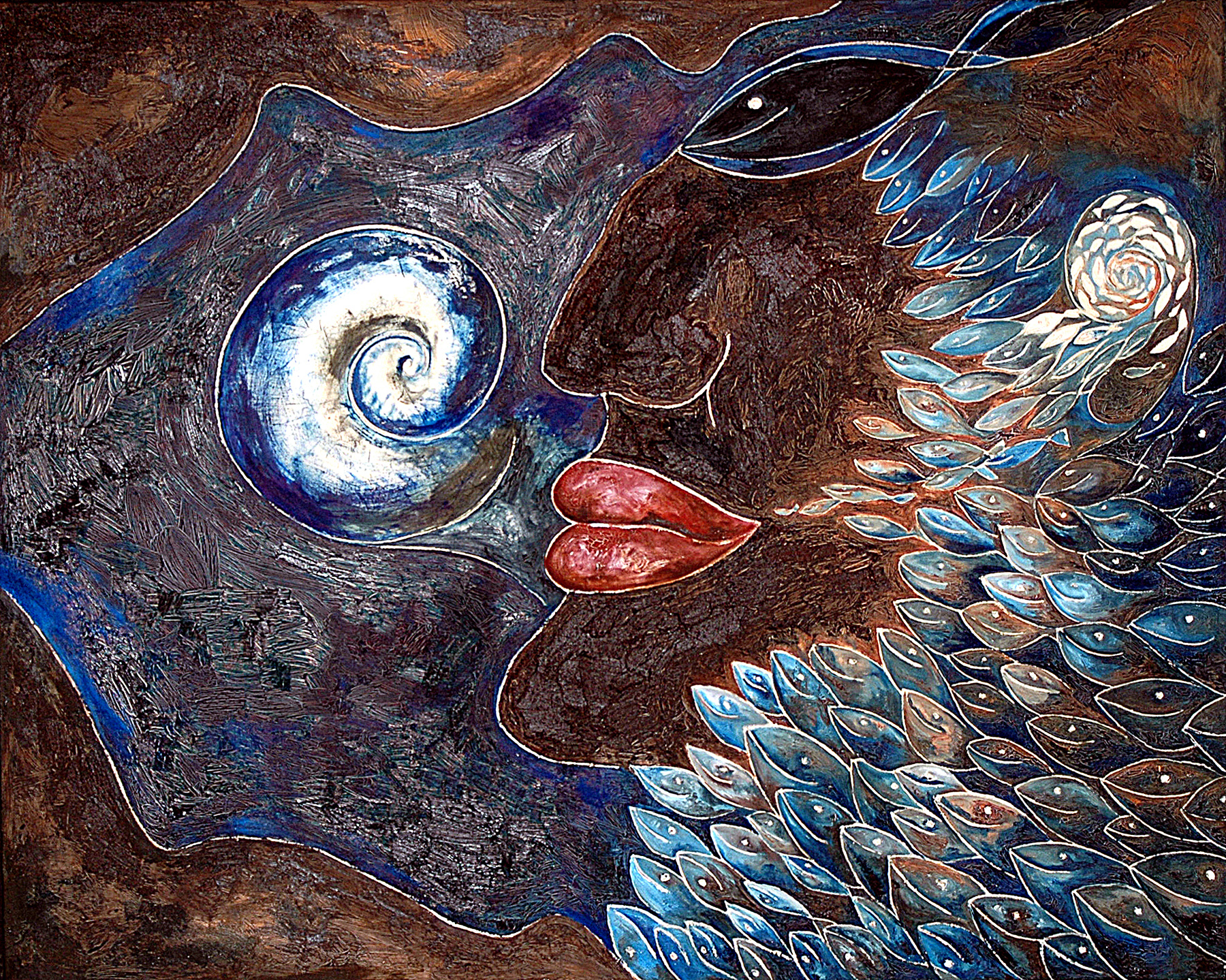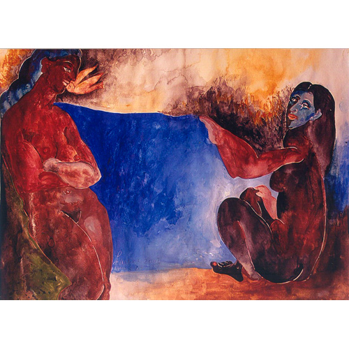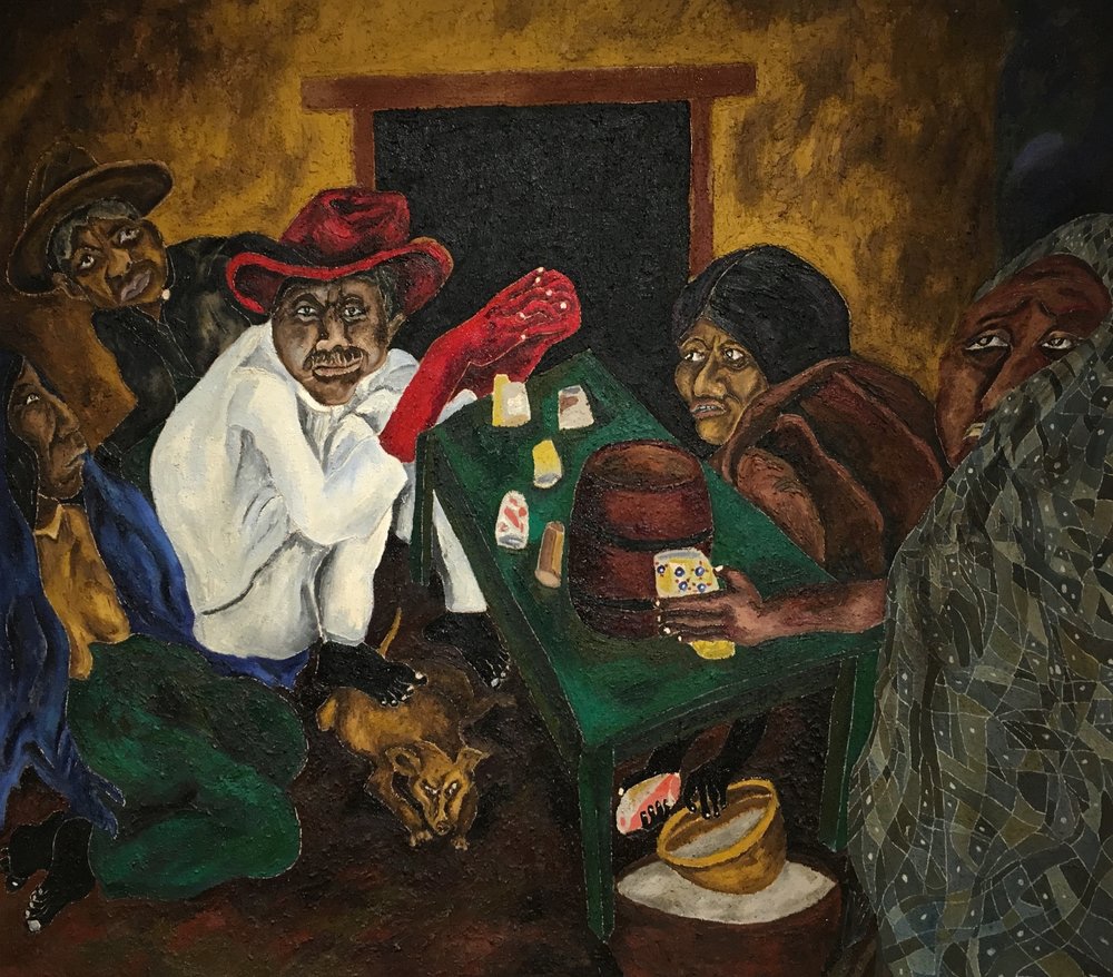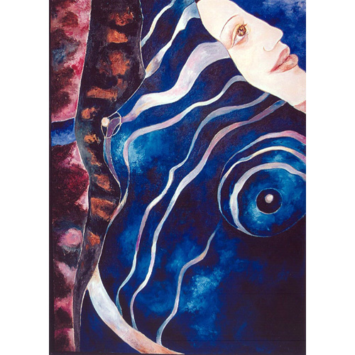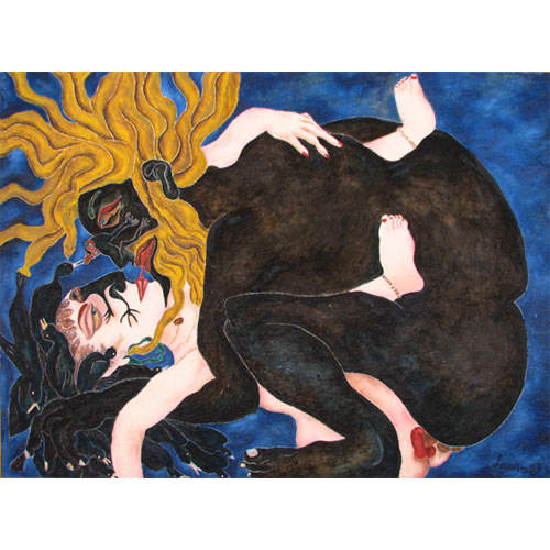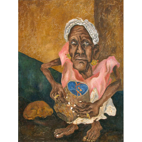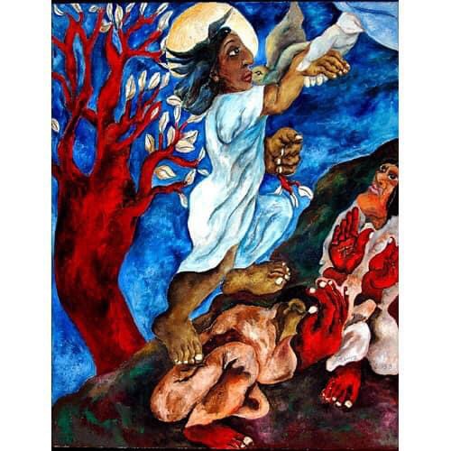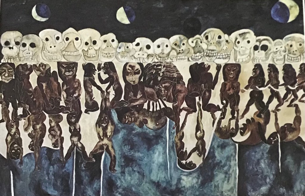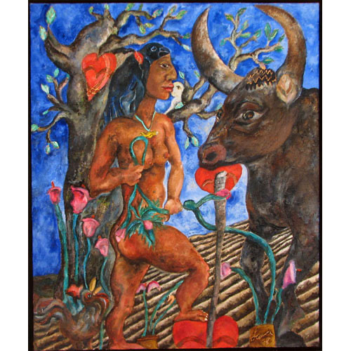 Her paintings a reflection of Mexico’s cultural heritage – a mixture of ancient history and indigenous folk art – familiar motifs of the Mexican psyche present – skulls, tortured human figures, life, death, nature, symbolic animals.