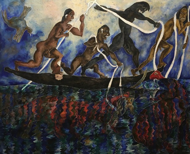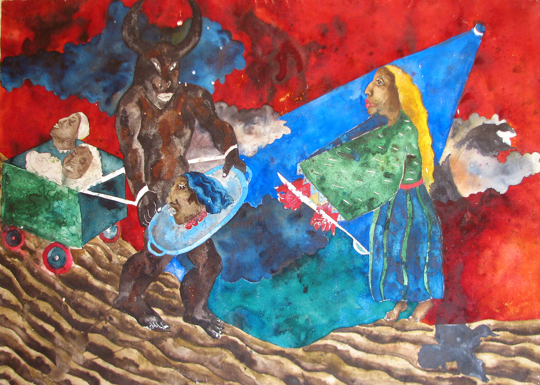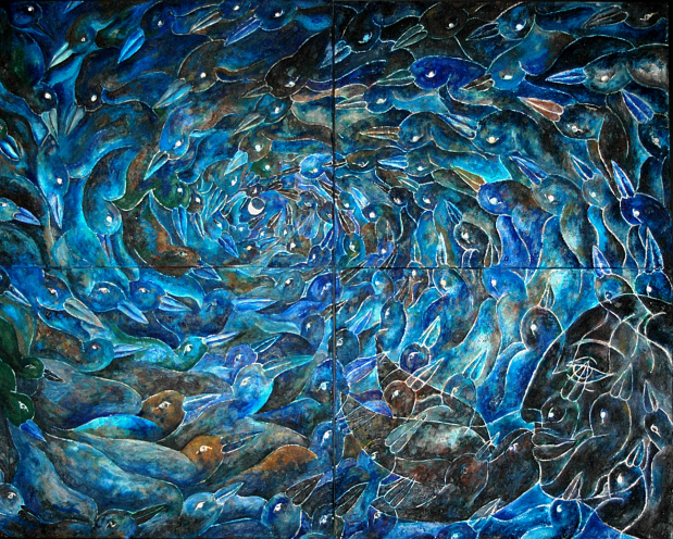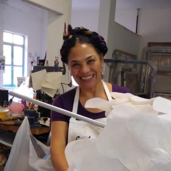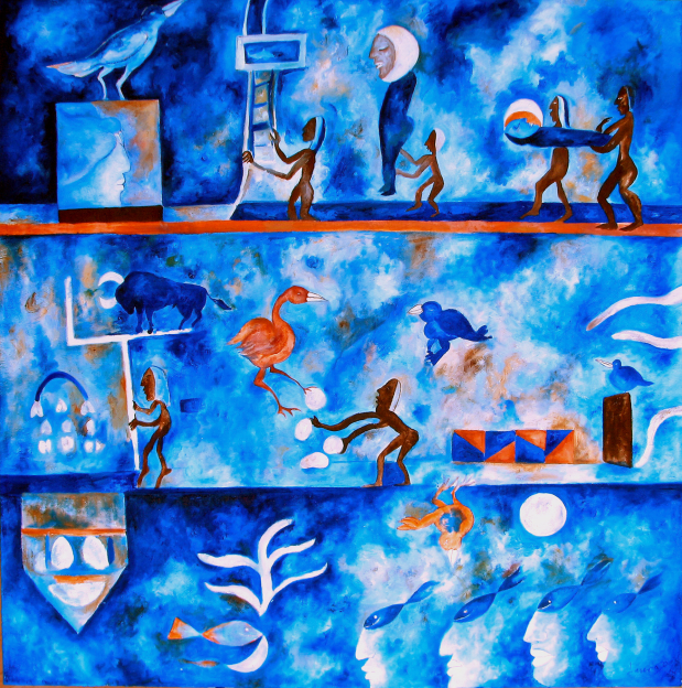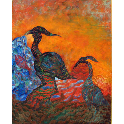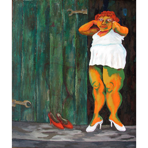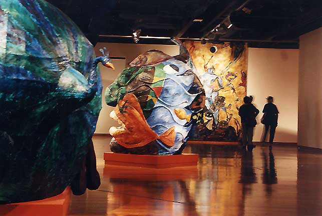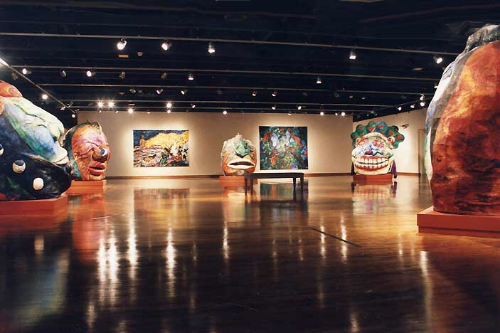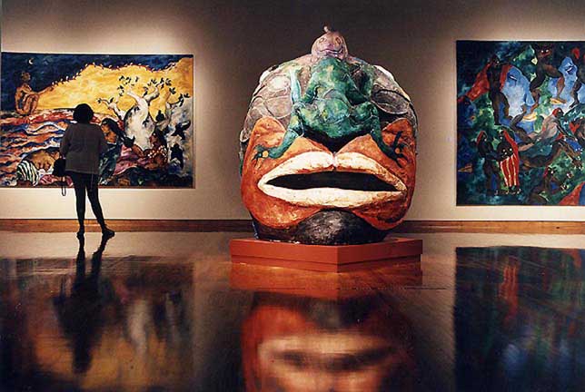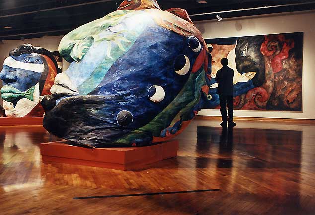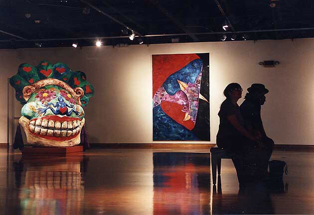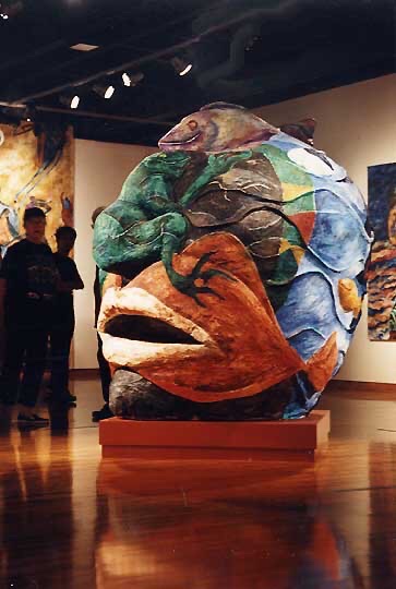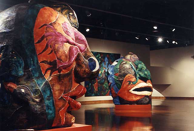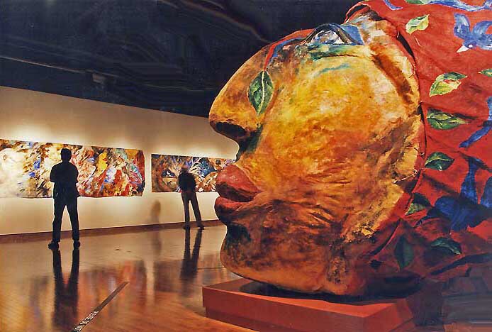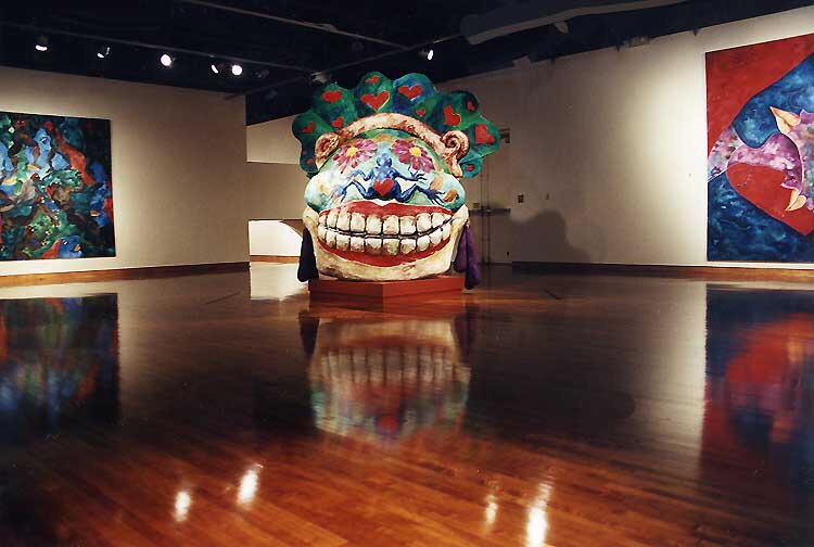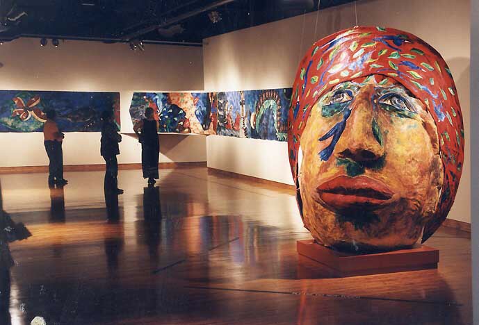 Her paintings huge, five by seven feet, common; the paper mache heads, eight feet high, painted with oil paints and mixed media, replicas of the ancient Olmec heads of Mexico.