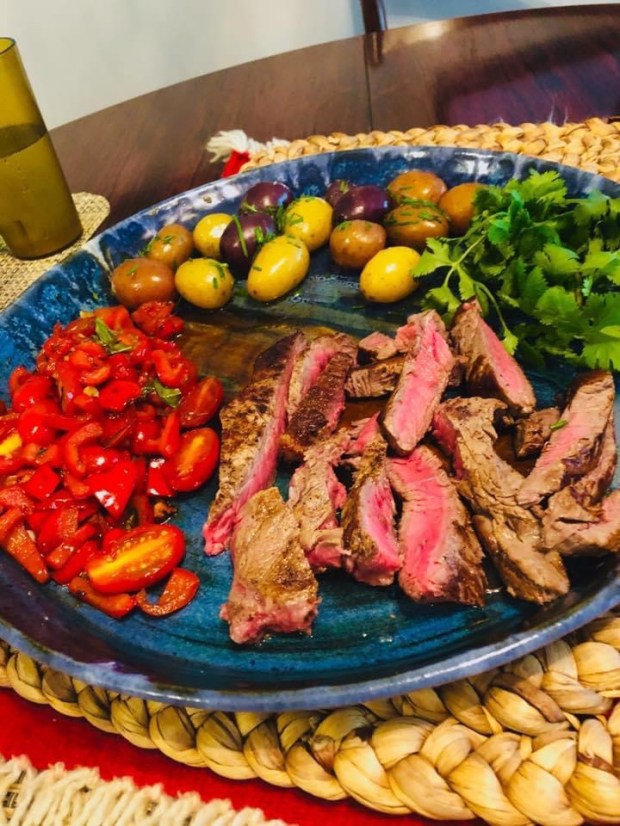 This is a symphony of bold flavours – the steak juicy with that rich beef taste, the veggies sweet and luscious, the potatoes creamy, the salad fresh and bright, a complement to the richness of the steak, the fruit salad bright and light.