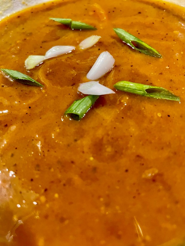 Take your green onion stalk, slice diagonally and use as garnish for the soup.