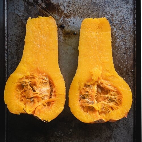 Cut your squash in half, scooping out the flesh and seeds at the bottom and discard. Now cut the squash into 1-inch cubes.