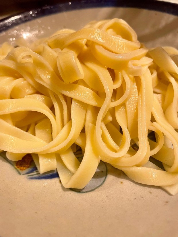 Add your butter to the pot, then your drained pasta . Now take your saved pasta water and add, mix thoroughly. Leave in the pot.