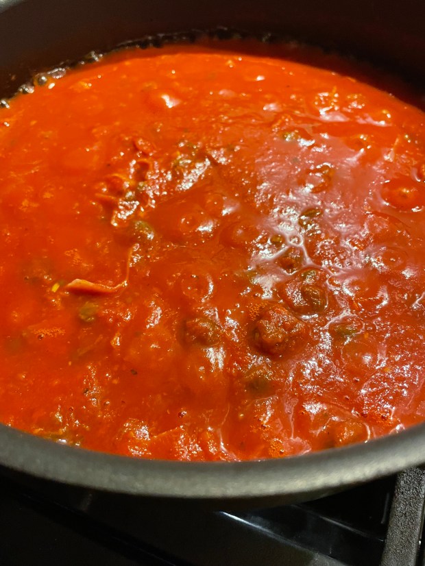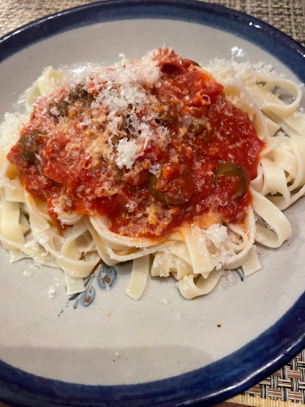 This serves two. Take a hearty, robust, tomato sauce filled with wonderful ingredients, add luscious pasta, a crusty baguette and a delightful tasty dinner awaits you.