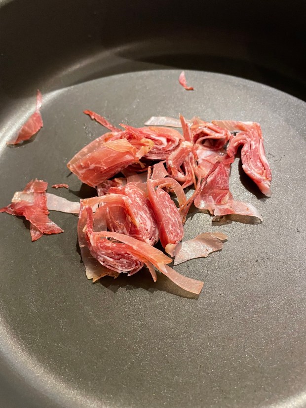 In a large saucepan, heat the oil. Add the prosciutto and cook for 6 minutes over moderate heat. Once done add the garlic, anchovies, crushed red pepper.
