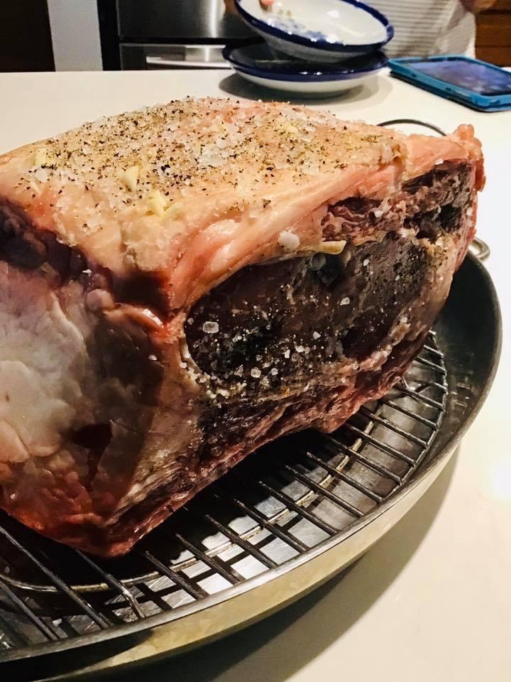 A Prime Rib roast of around eight pounds. And that usually has three ribs.