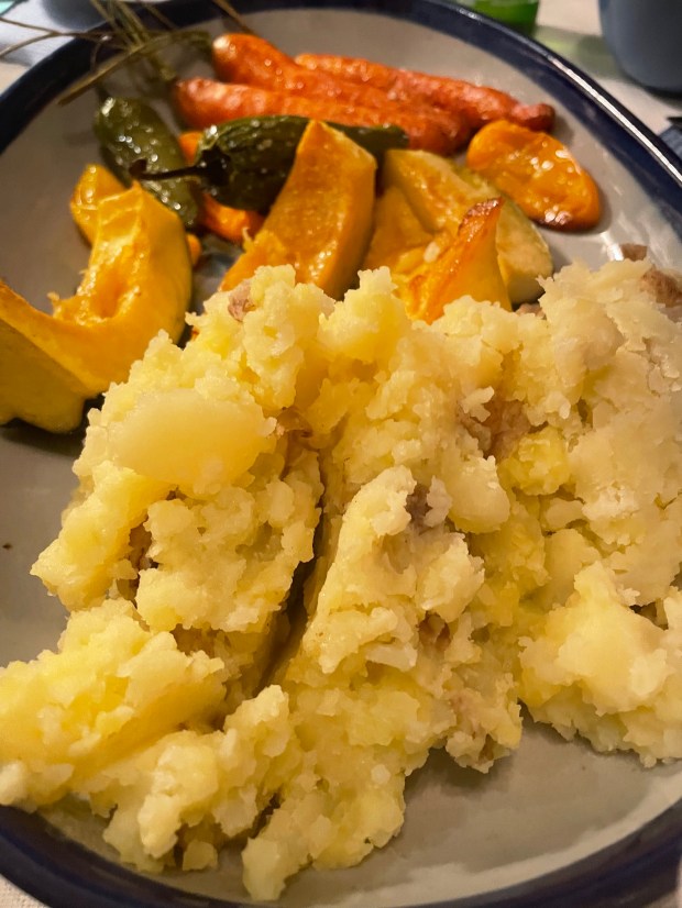 Slice your potatoes into chunks, boiling them for 20 minutes. Once done, using a potato masher, mash adding your butter-milk mixture. Cover and set aside.