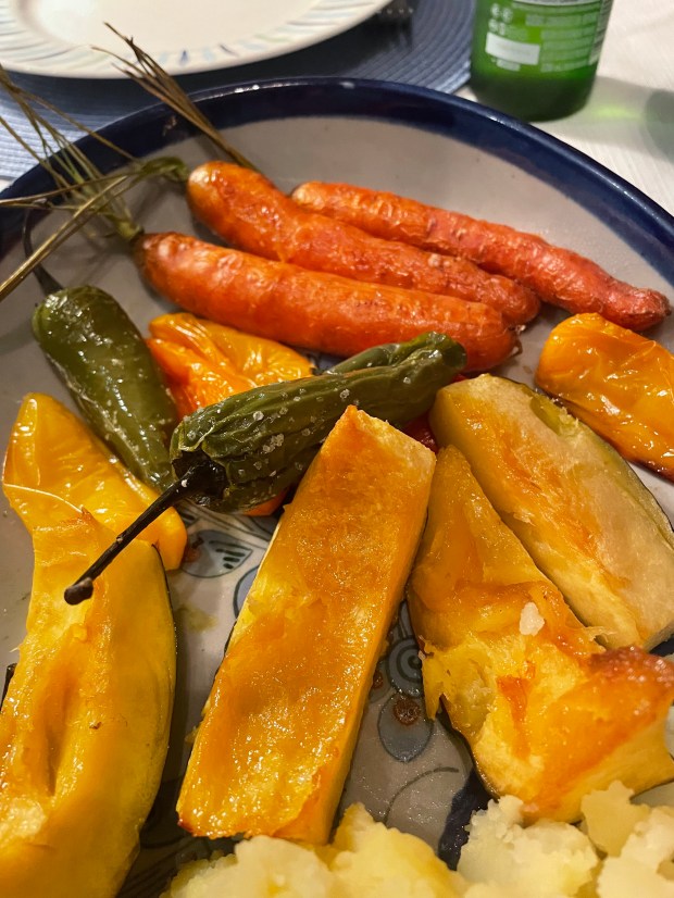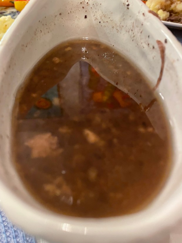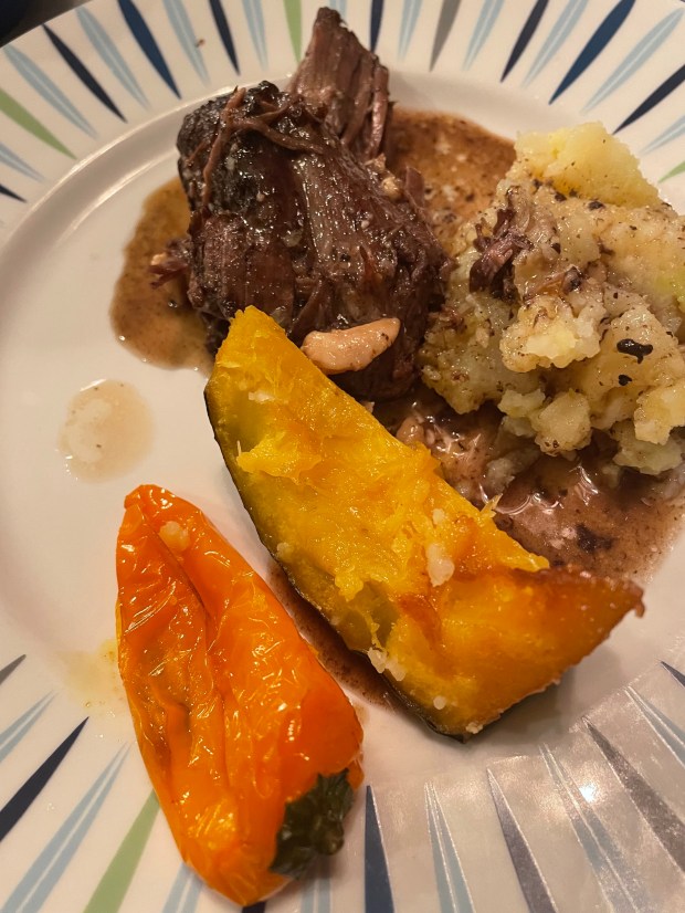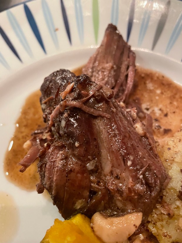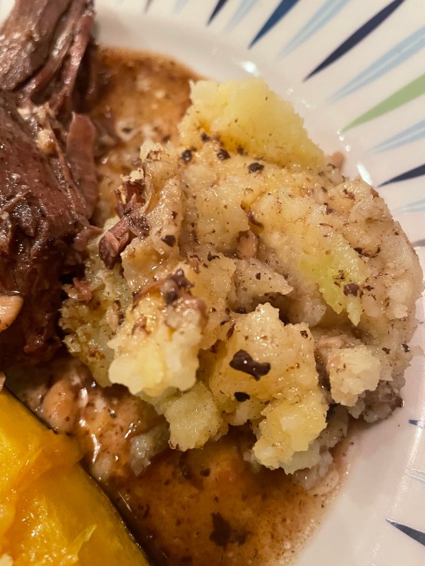 Delicious pot roast, slow cooked for 10 hours, with spices and a bottle of red wine, adds up to a hearty, yummylicious, stew with a gravy -to die for – plus sweet roasted vegetables and an earthy tasting potato mash.