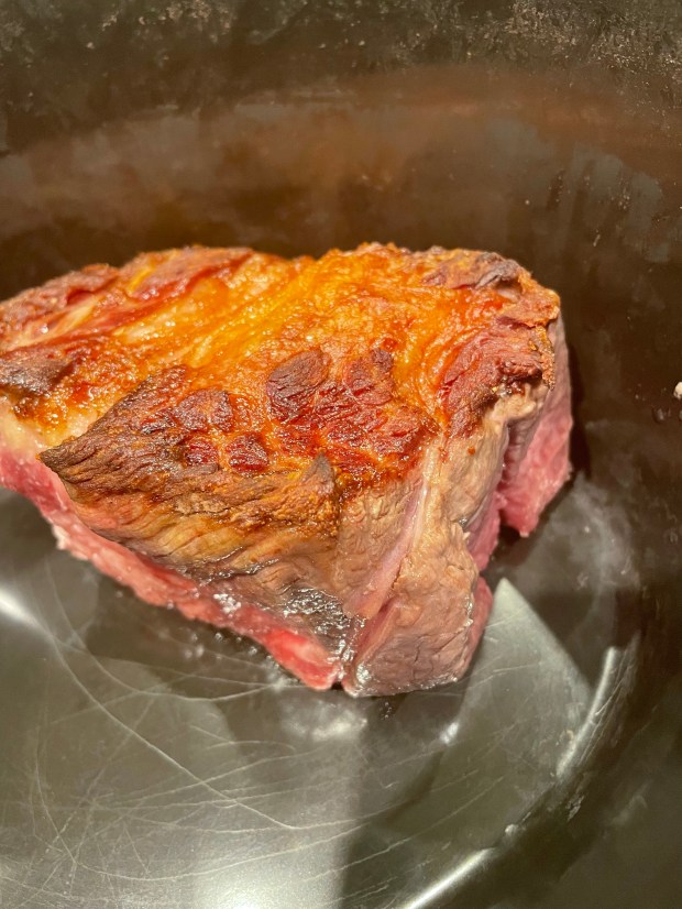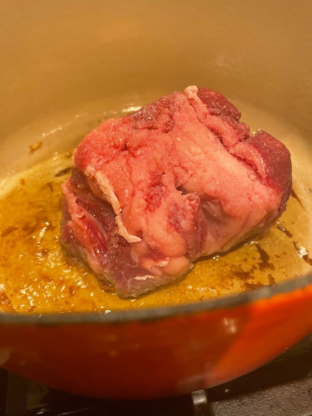 Cut your pot roast into two chunks. Season generously with salt on all sides. In a pre-heated pot, medium high heat, add one chunk and cook for five minutes to brown. Once done take out, set aside and repeat the same process for the other chunk. There is no need to brown the meat on all sides. You only need one side to develop great flavour for the meat