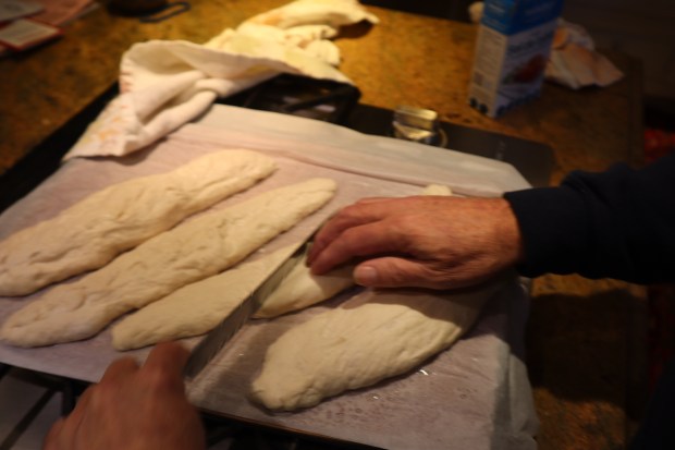 Flour your working surface, turn out the dough and cut in four. Shape your baguettes by gently stretching and rolling. Place on parchment paper. Score the bread with a lame or a knife.