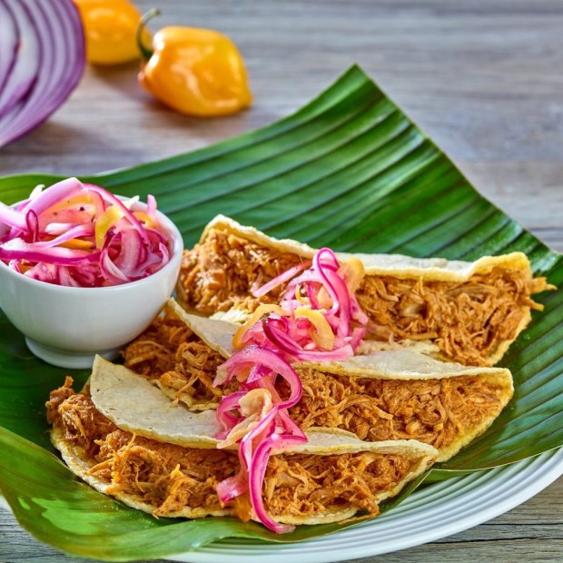The dish dates back to Mayan times – suckling pork loin is rubbed with a red paste from the seeds of the annatto tree.