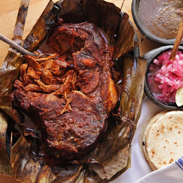 Then it is marinated in the sour juice of Seville oranges. Next it is wrapped in banana leaves and thrown into a pit lined with smouldering wood, hot stones, then covered with more wood and banana leaves.