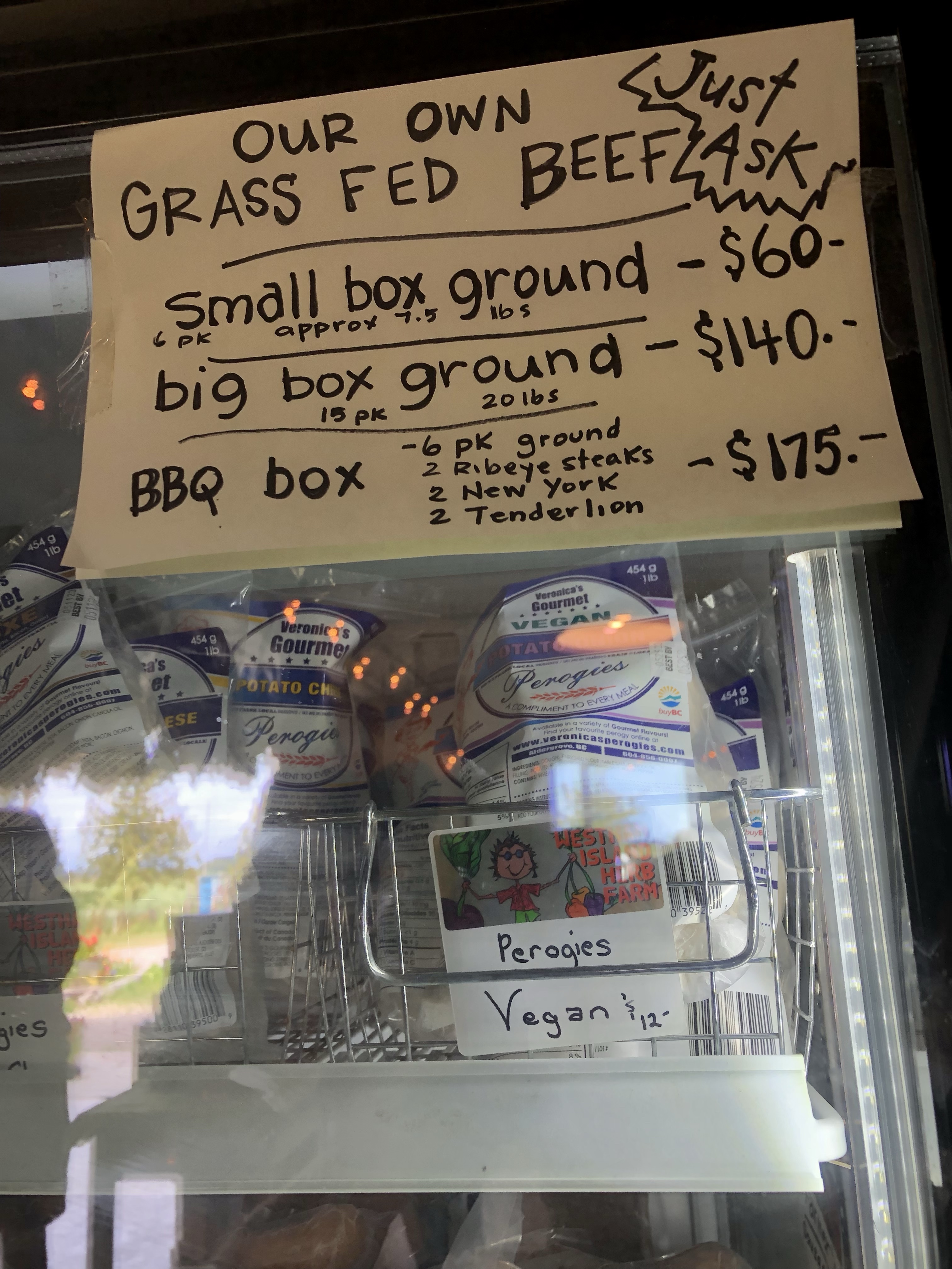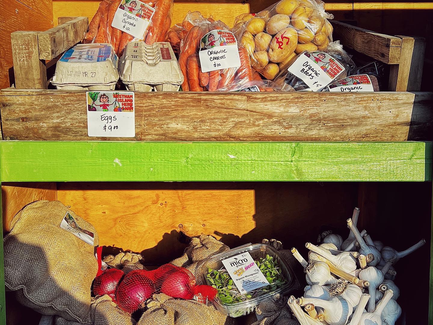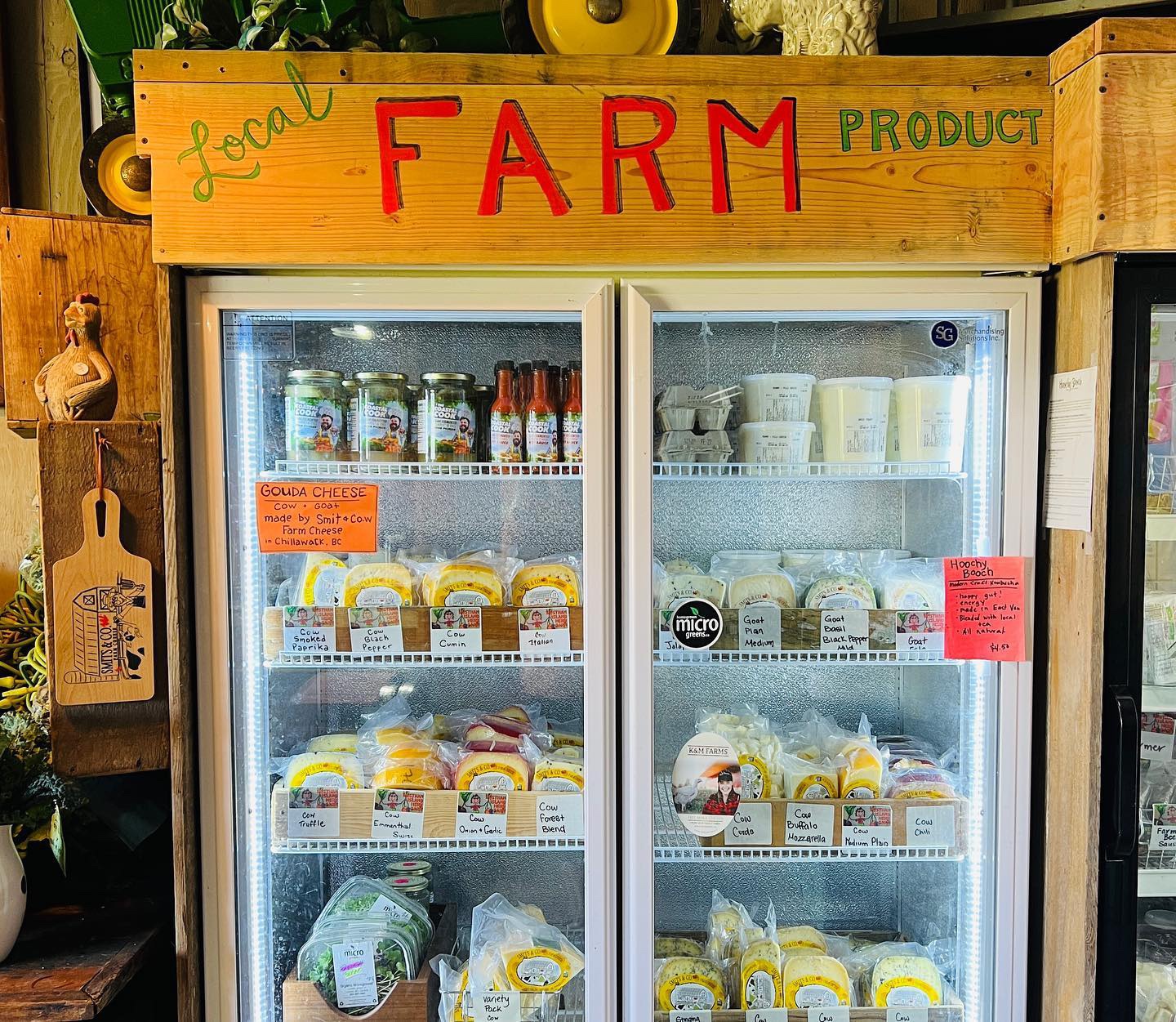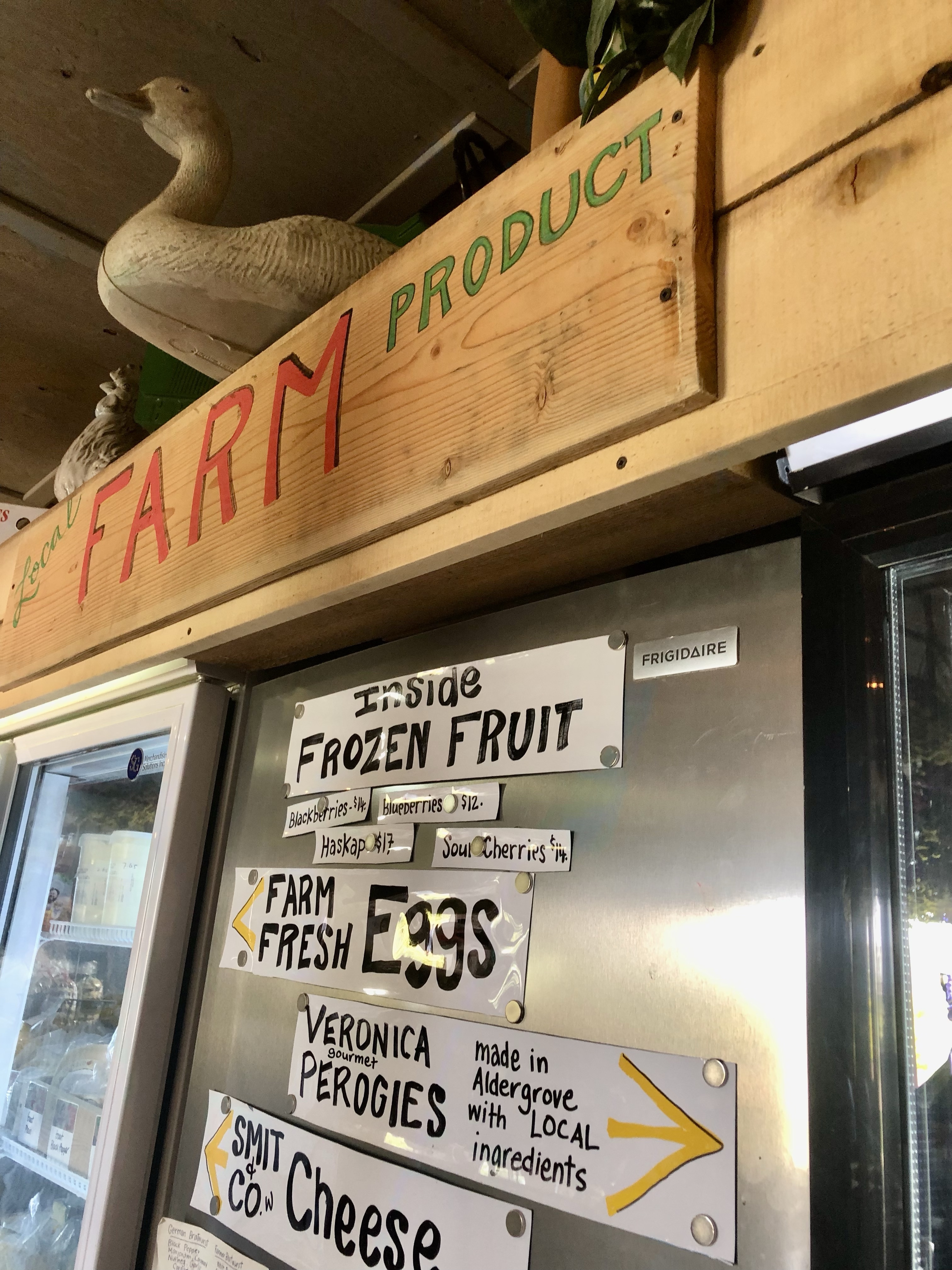 Inside the barn – a cornucopia of fresh vegetables, fruit, condiments, accessories, home-made baked goods, frozen meats from the farm.