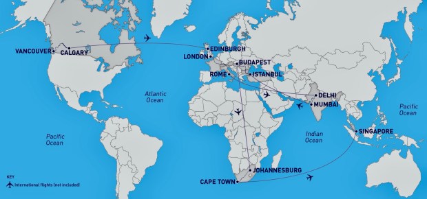 It starts in Vancouver, Canada, and ends in Singapore.