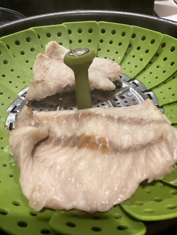 Place your fish in the steamer basket. Fill your pot with water enough to come close to the steamer basket.