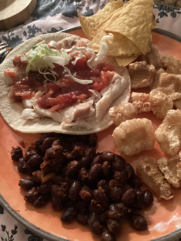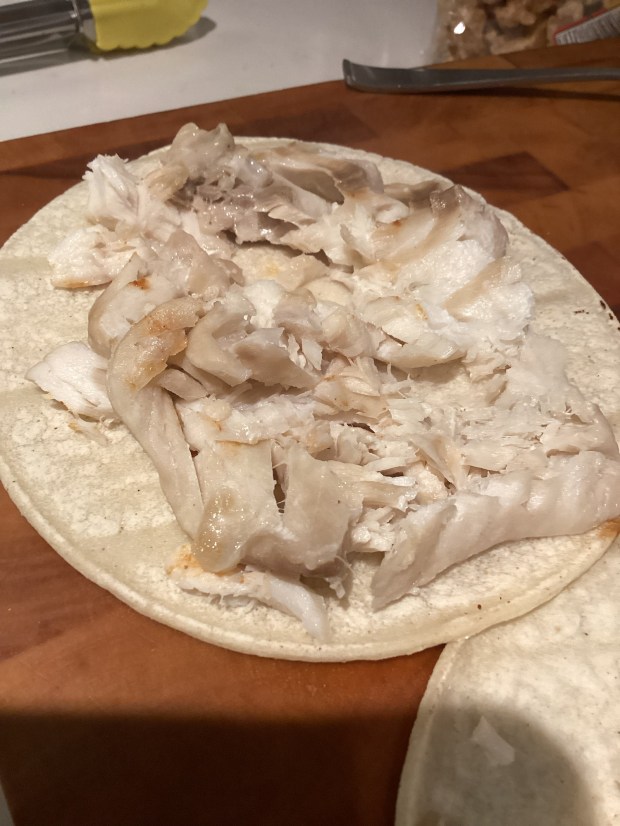 When done, place on a plate, add some of the fish, along with some coleslaw. Add some black beans and some salsa.