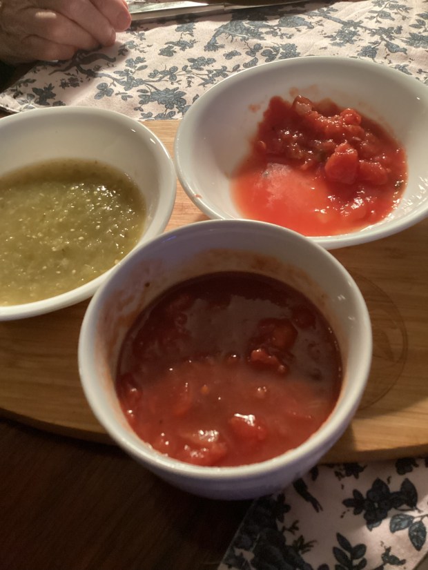 A variety of salsas, store bought – we used three, regular red, chipotle, green tomatillo.