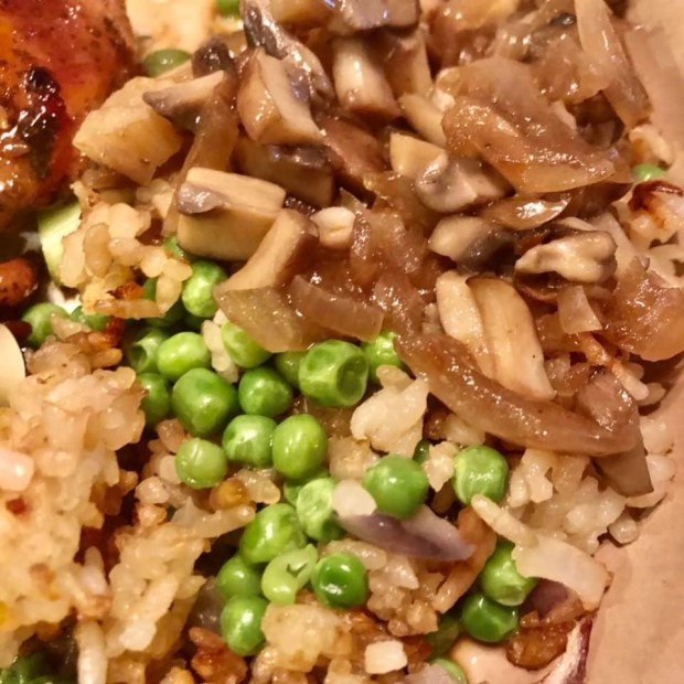 Add the olive oil and heat up on the stove till it shimmers on medium heat. Then add your onions, cook for about six to seven minutes, make sure they don’t burn and you may have to turn the heat down a bit, then add your mushrooms, cooking for three to four minutes, you don’t want to overcook them them, so they retain that nice firm texture and retain that mushroom taste, finally add your garlic, cooking for another minute. Always keep stirring everything so the flavours mingle well. Salt and pepper to taste.