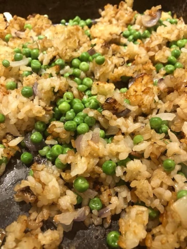 Once your rice is done add the soya sauce, sesame oil, and the peas, making sure to mix everything well into the rice.