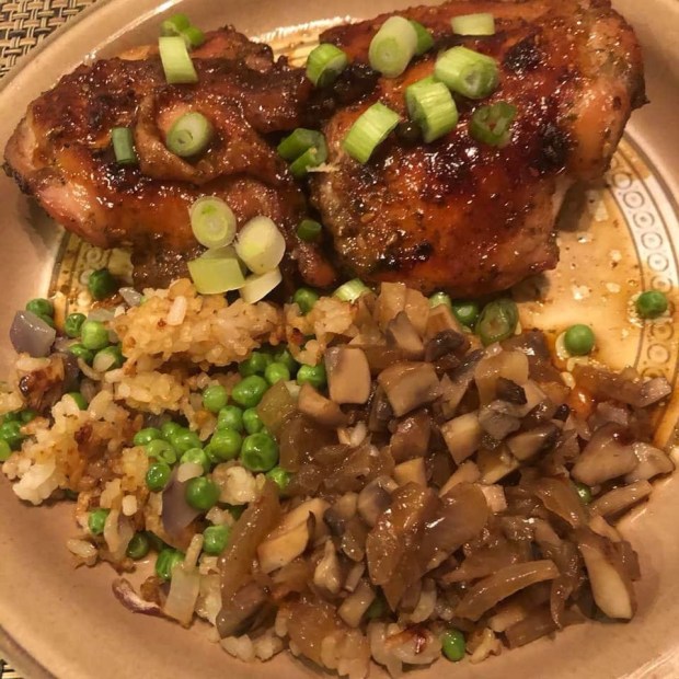 This dinner serves two. Chicken thighs are terrific, reasonably priced, meaty, easy to cook and full of flavour.