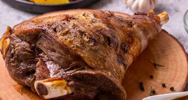 Take your lamb and insert sliced garlic (four big cloves) into the meat by making small incisions in the meat with the edge of a sharp knife.