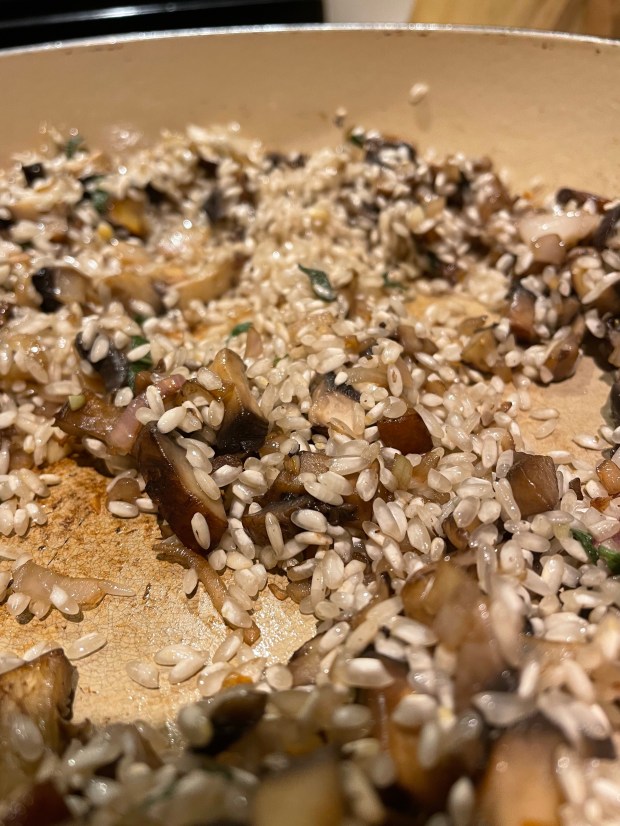 Once your oil shimmers add the risotto and keep stirring around with your wooden spoon till all of the of the rice has sheen to it and is a bit on the brown side. Add your shallots and mushrooms, keep stirring for another two minutes or so. Make sure the rice is not burned, if it appears to do so, turn the heat down.