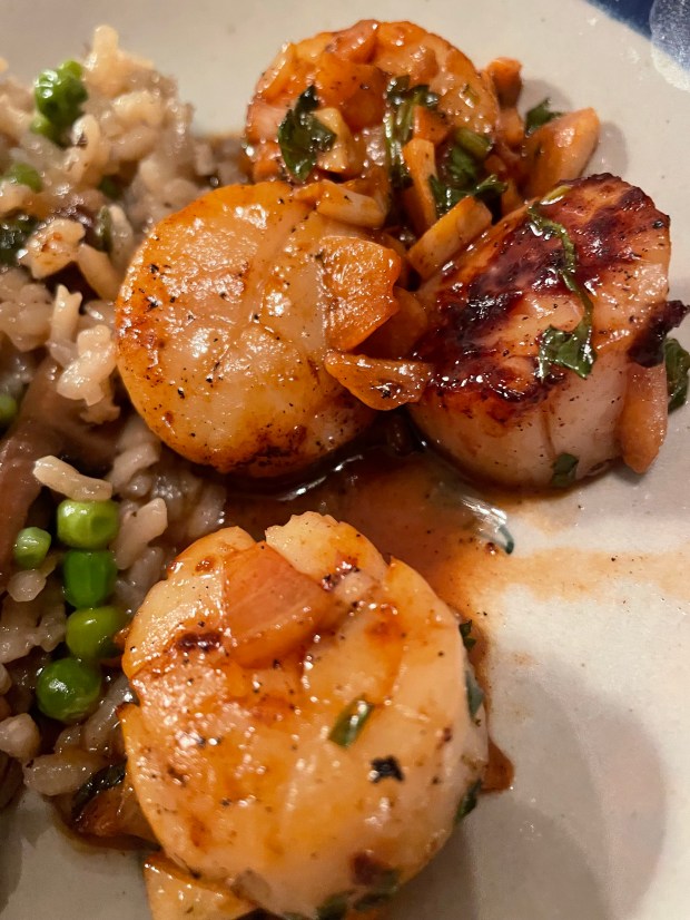 This dinner is for two – flavours galore: luscious, flavoursome, creamy risotto pairs well with tropical style, sweet, scallops.