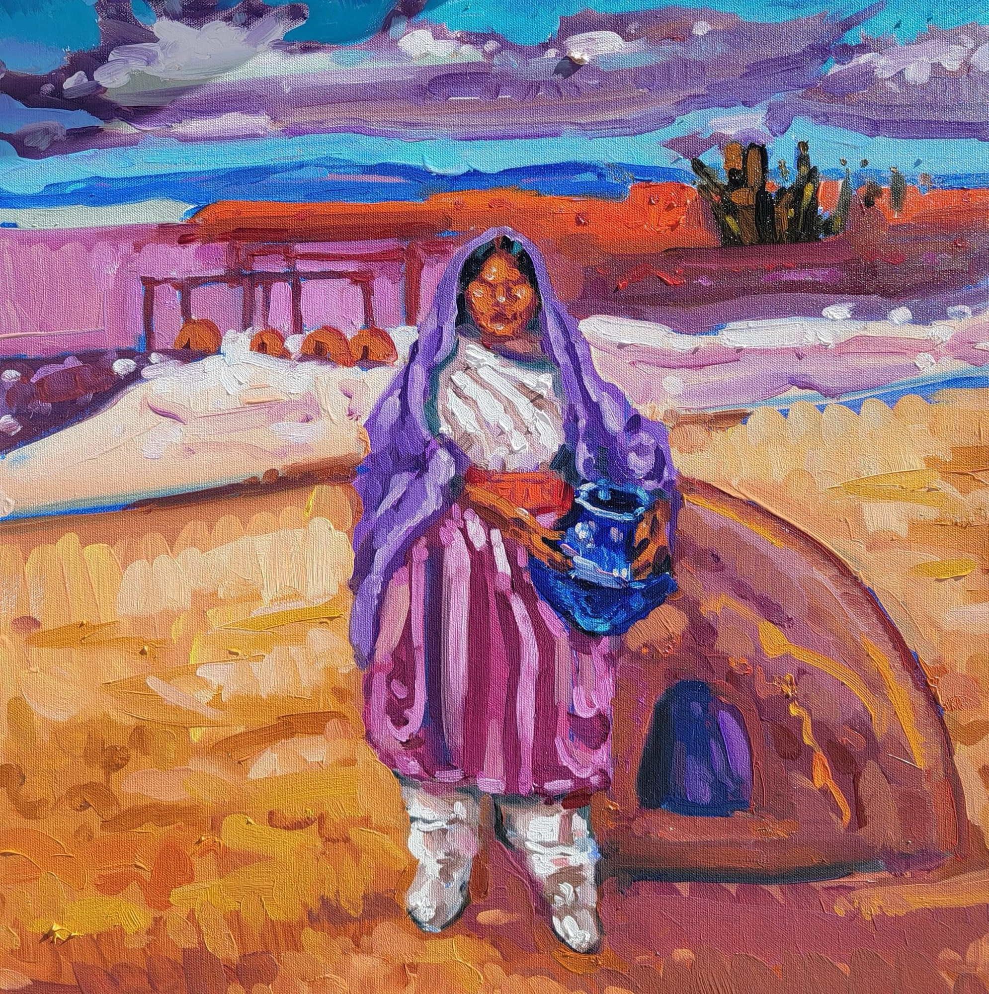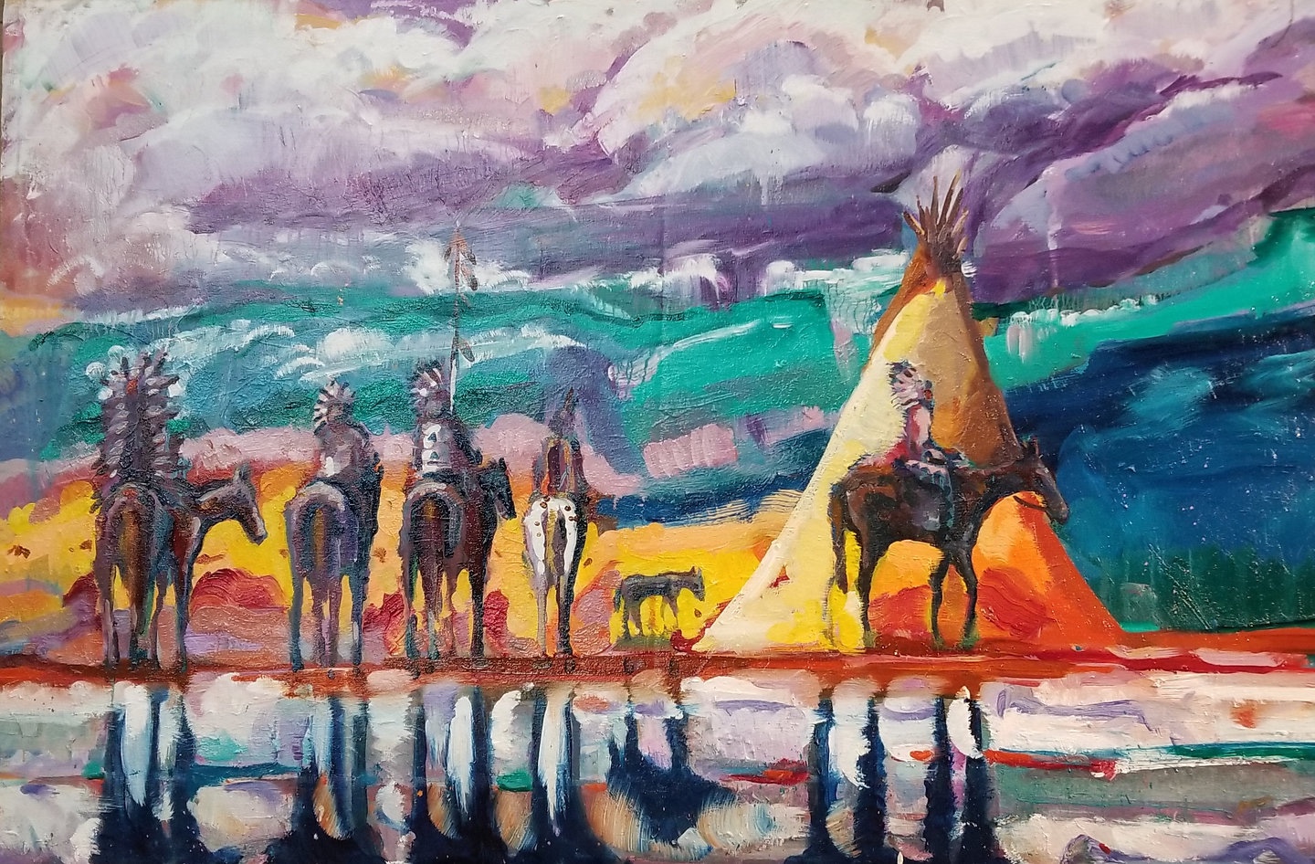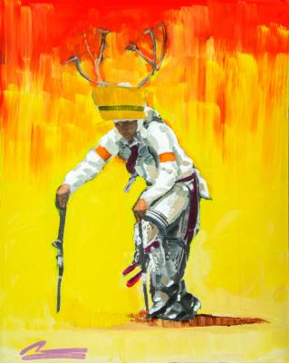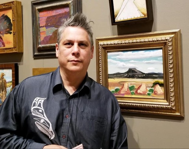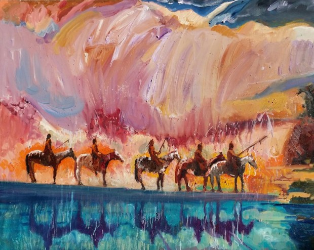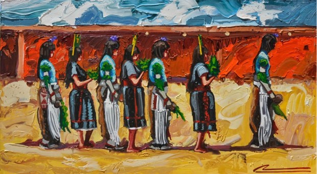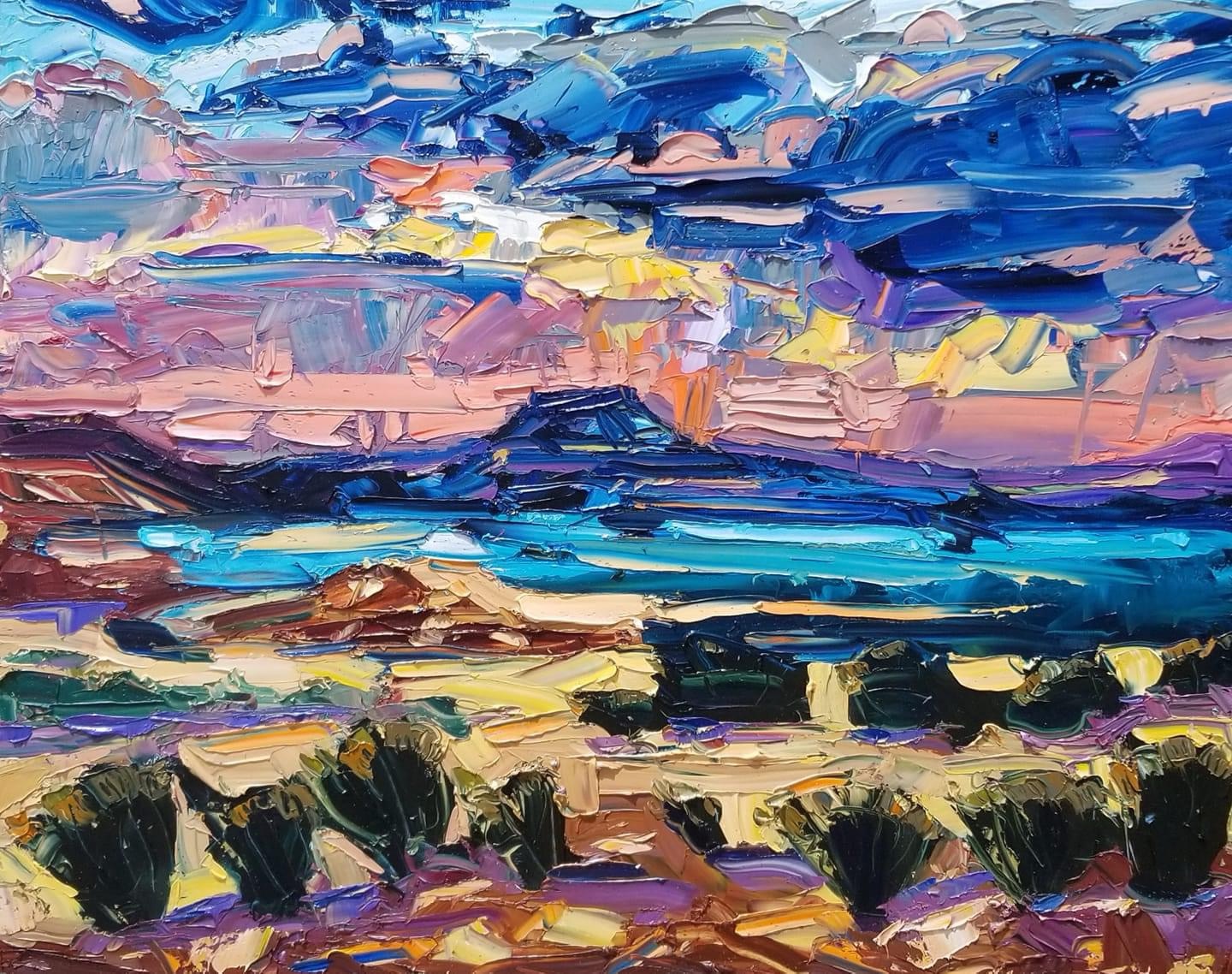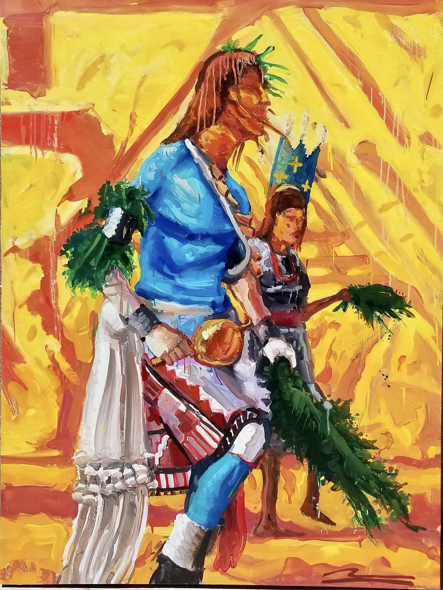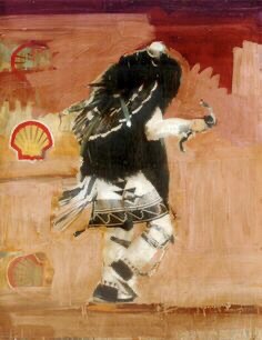 His art juxtaposes, in his words, ”timeless, archaic elements of Pueblo culture…(with) contemporary abstract expressionist palette knife and brush work.”
