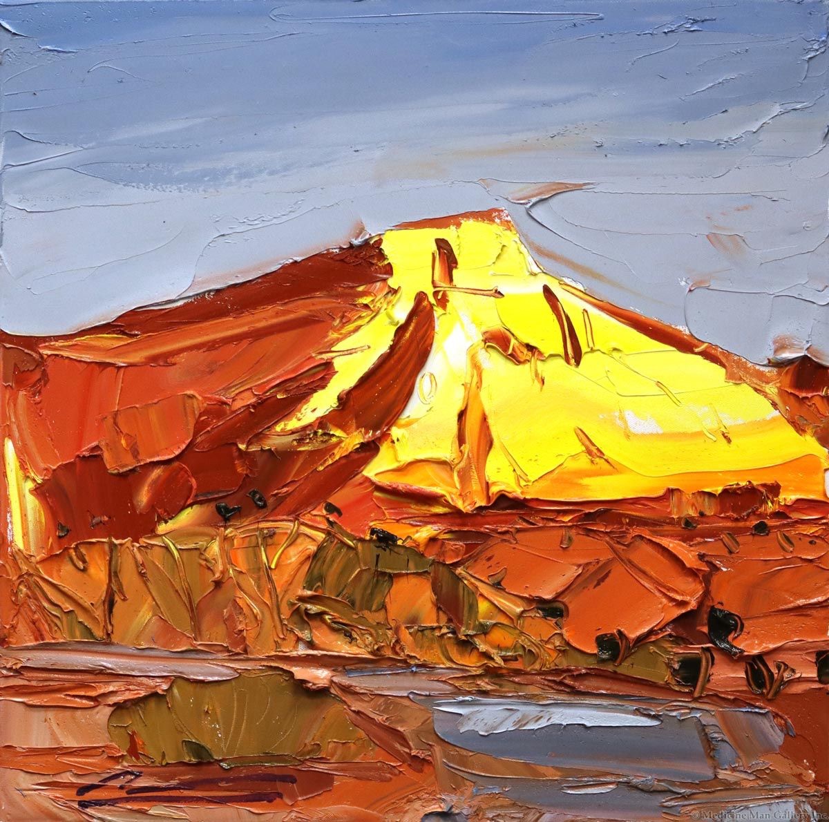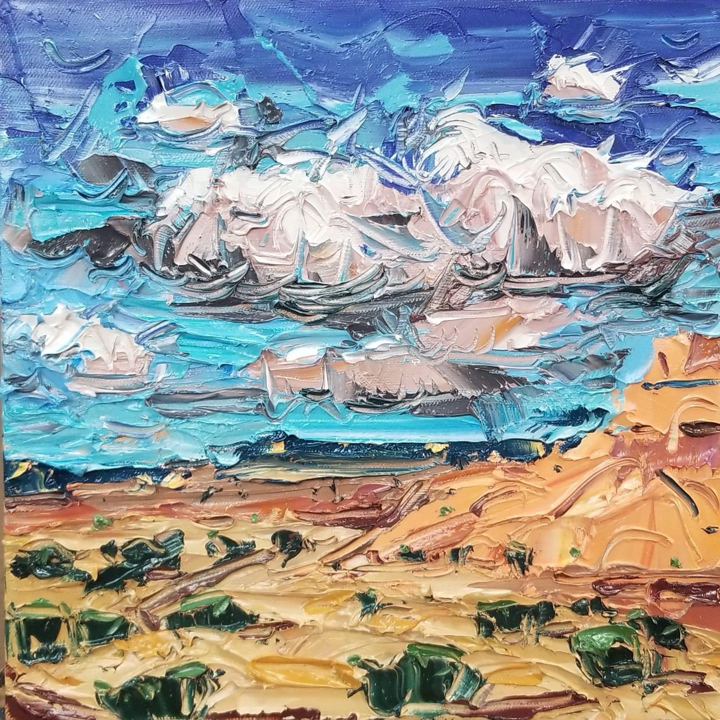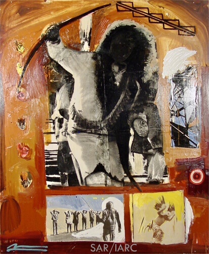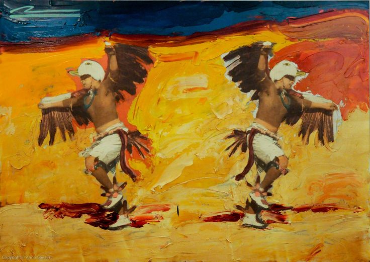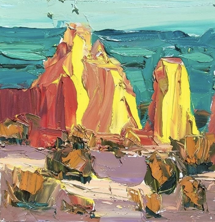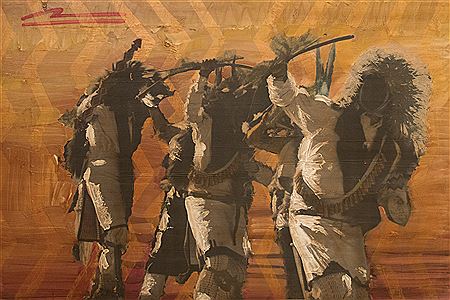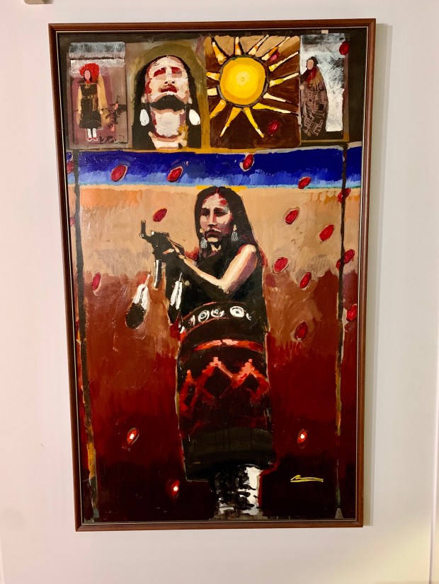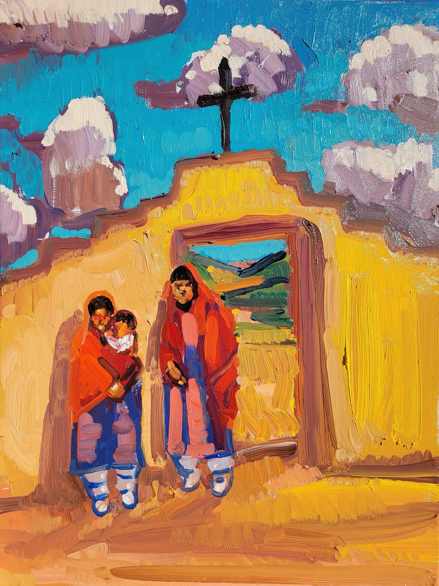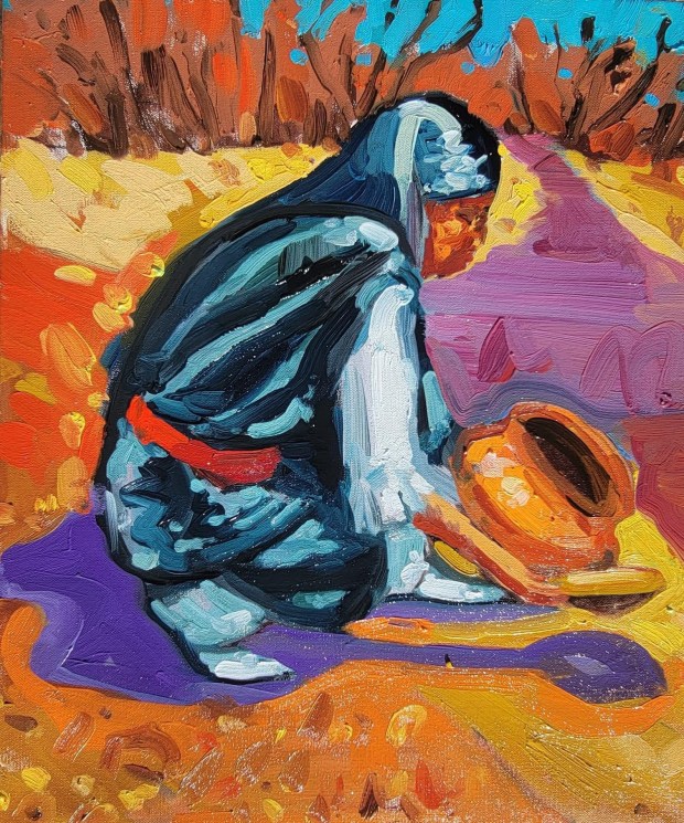 His art juxtaposes, in his words, ”timeless, archaic elements of Pueblo culture…(with) contemporary abstract expressionist palette knife and brush work.”