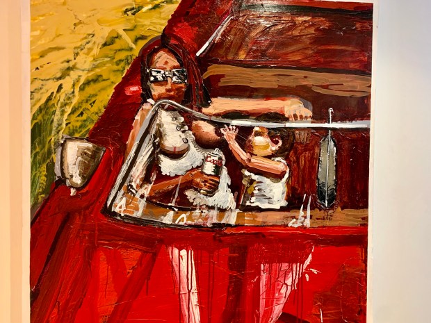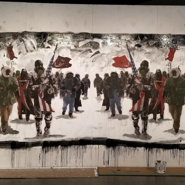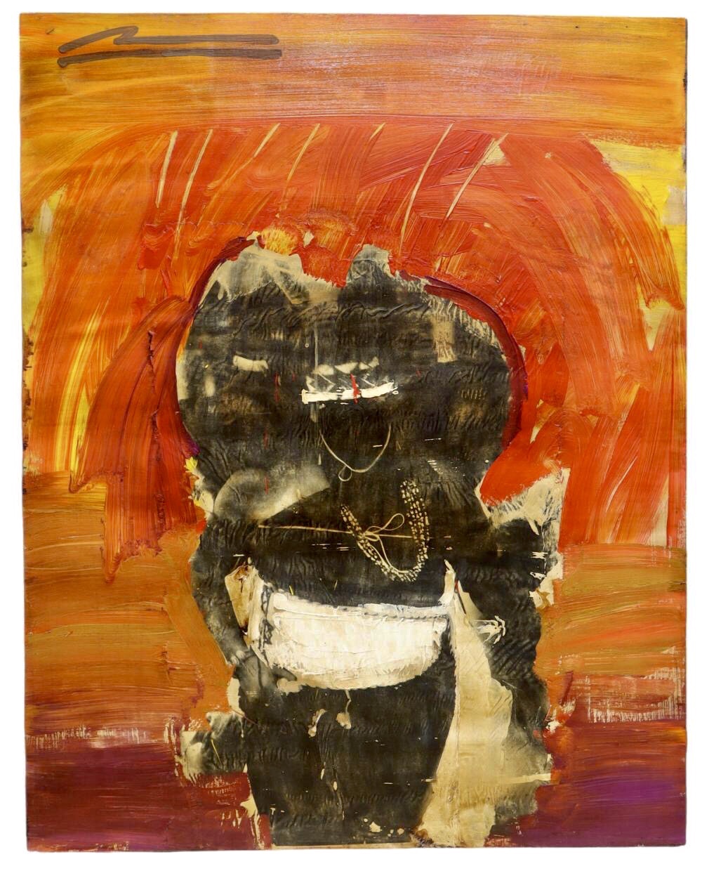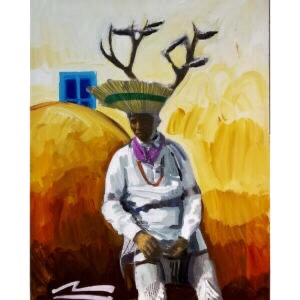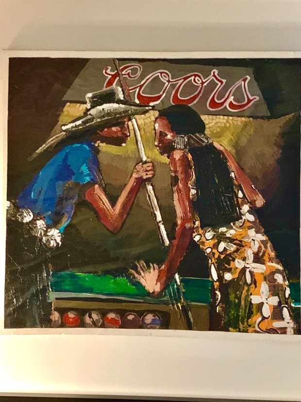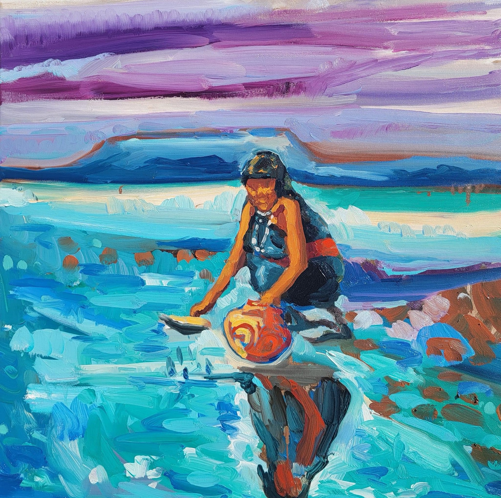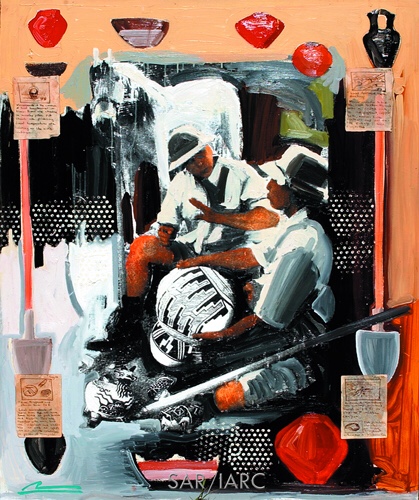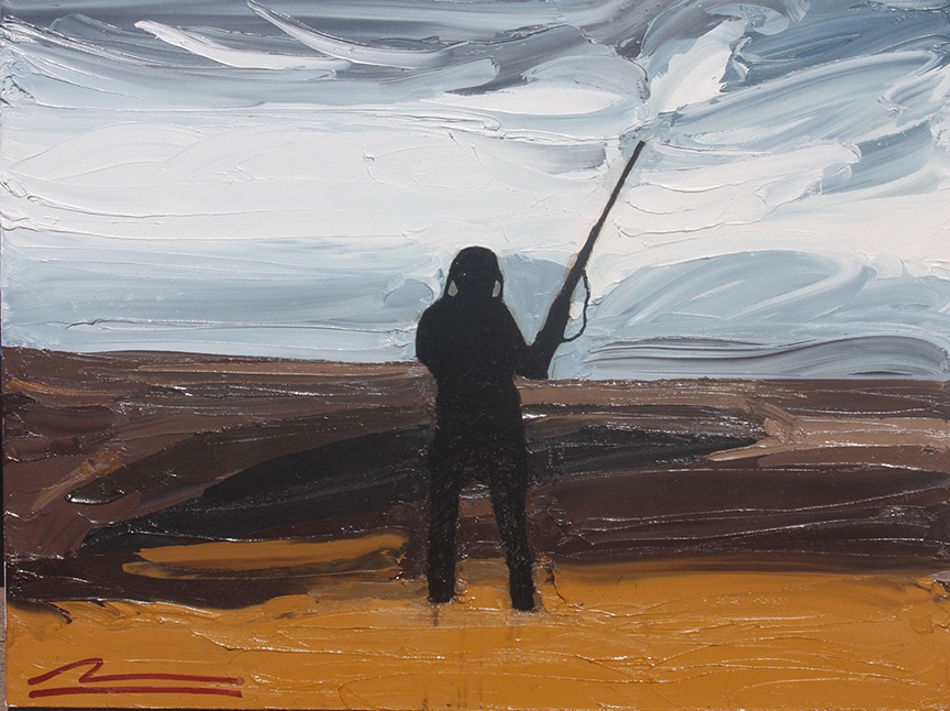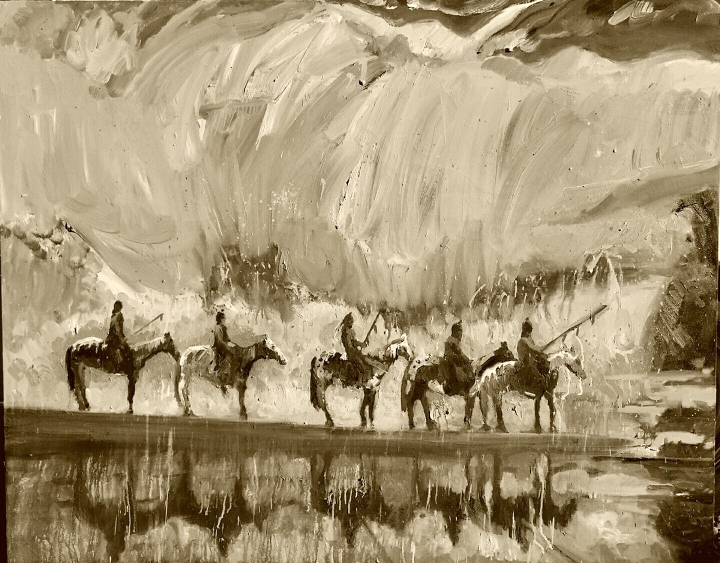 His art juxtaposes, in his words, ”timeless, archaic elements of Pueblo culture…(with) contemporary abstract expressionist palette knife and brush work.”