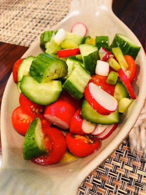 Cut up your tomatoes, cucumbers, radishes and green onion.