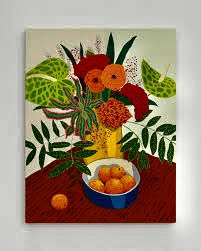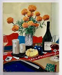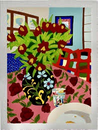 There is a focus on domestic interiors, landscapes and still lifes, characterized by bold, rich, saturated colours, geometric patterns and strong linework.