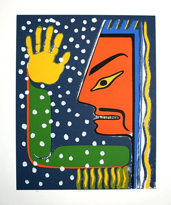 His paintings and prints are equally diverse, ranging from acrylics on canvas to mixed media works, pieces on paper – often exploring themes of nature, spirituality, and identity – all done in vibrant colours and dynamic compositions.