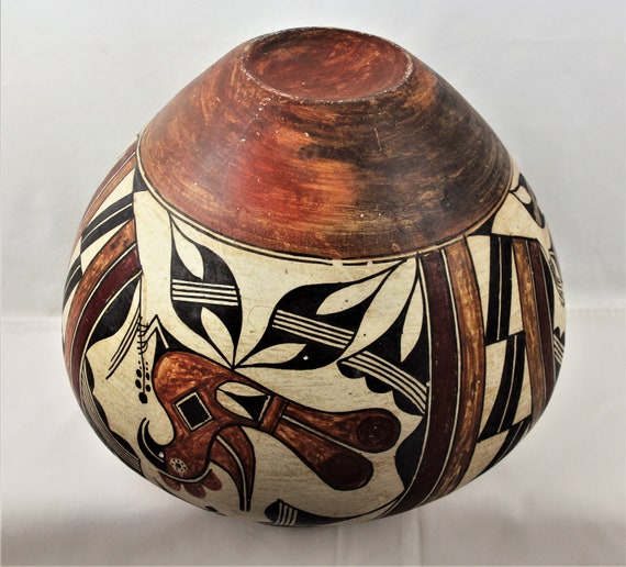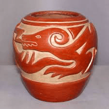 It features intricate designs, consisting of geometric patterns, animal motifs, and symbols representing the forces of nature: rain, lightning, mountains, done in traditional colours of black, white and orange with many younger, contemporary, potters, introducing more vibrant hues.